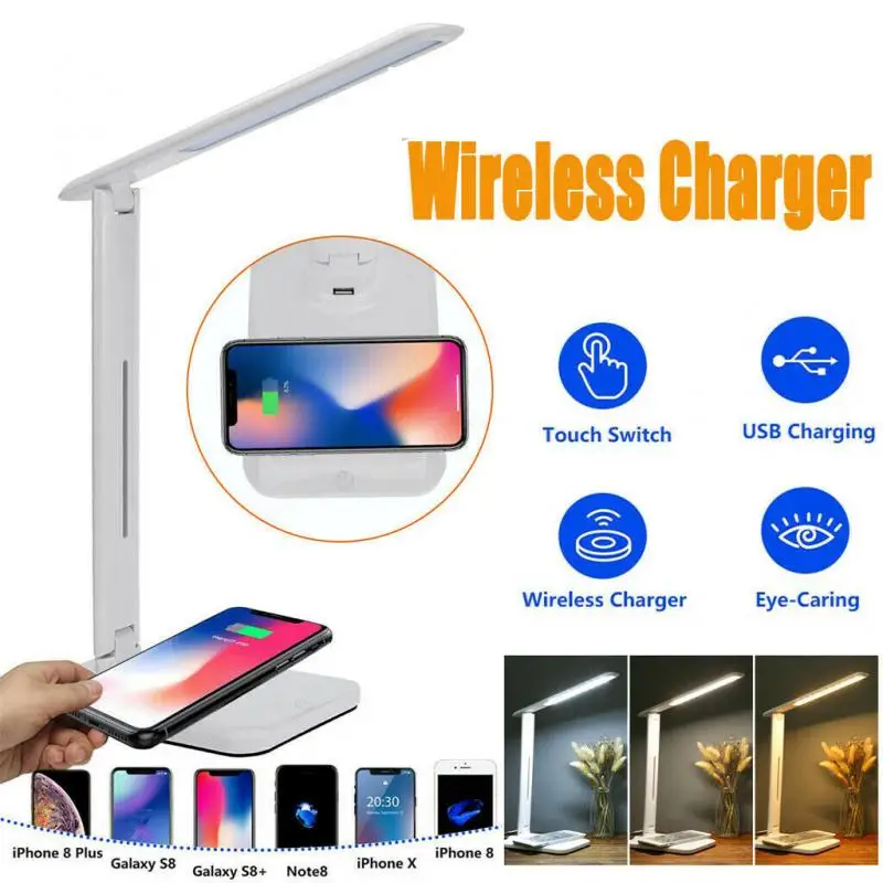 Светодиодная сенсорная настольная лампа QI, беспроводное зарядное устройство для телефона, трехскоростное затемнение, 10 Вт, 28 светодиодный Дов, USB настольная лампа, защита глаз, светильник для чтения