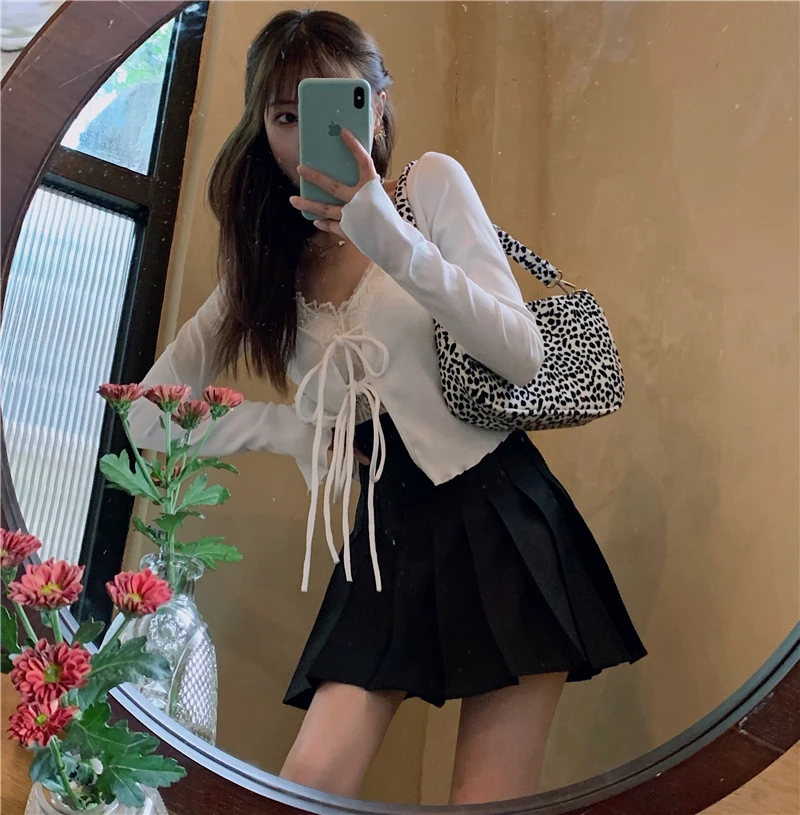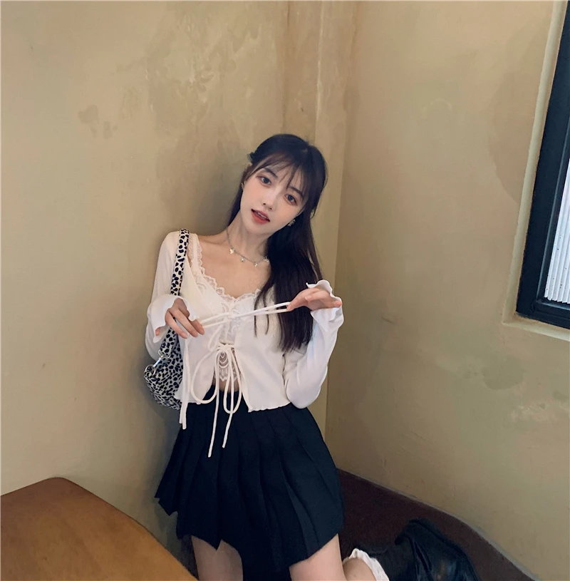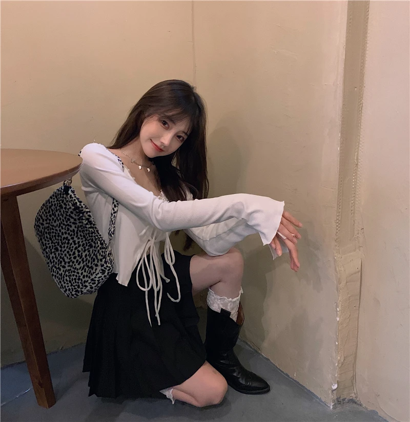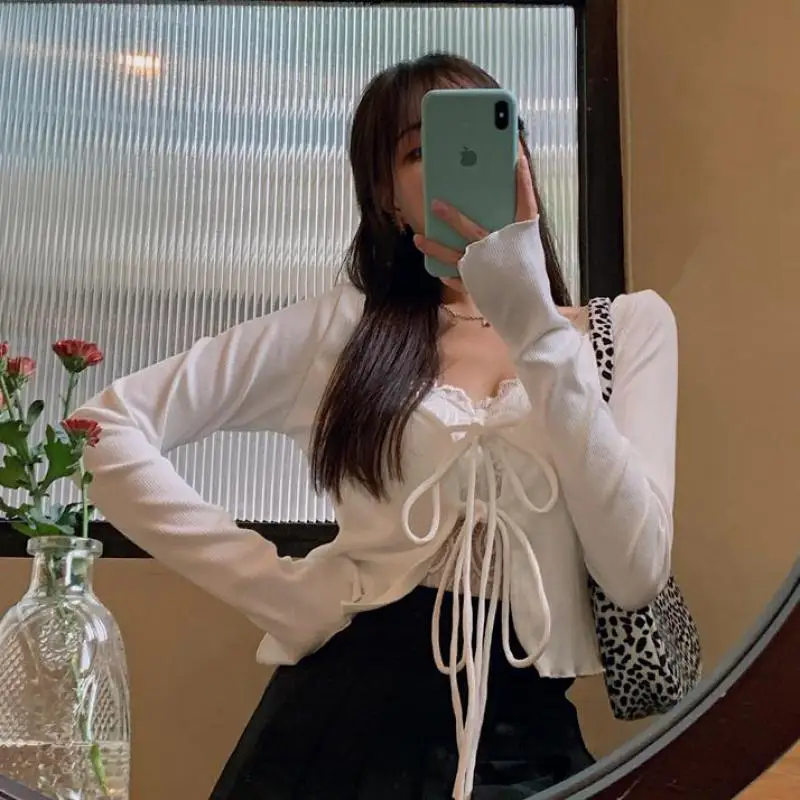 Пикантный винтажный Топ Tonngirls Y2k, трикотажный топ с V-образным вырезом, женский летний осенний белый кардиган на шнуровке, тонкий кардиган с длинным рукавом, вязаный