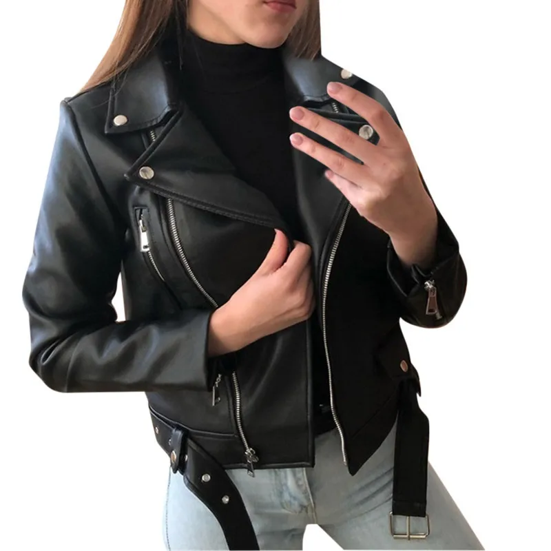 Куртка женская Байкерская из искусственной кожи, на молнии, с поясом
