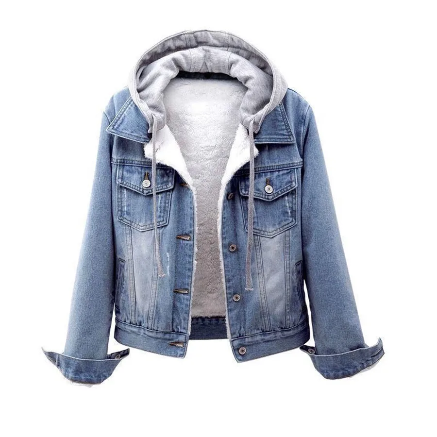 Куртка женская джинсовая с капюшоном, утепленная флисовая короткая ...