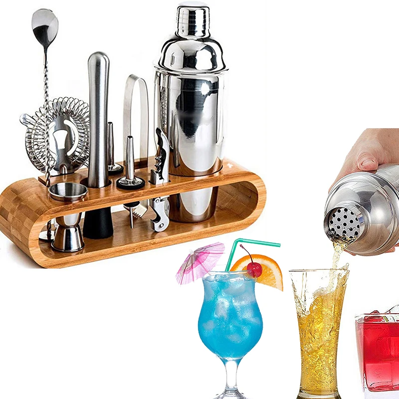 10 шт.компл. 750 мл коктейльный шейкер из нержавеющей стали, миксер для напитков, набор для бармена, набор инструментов для бара с винной стойкой, деревянная подставка