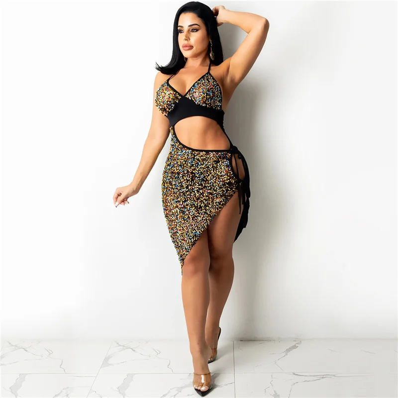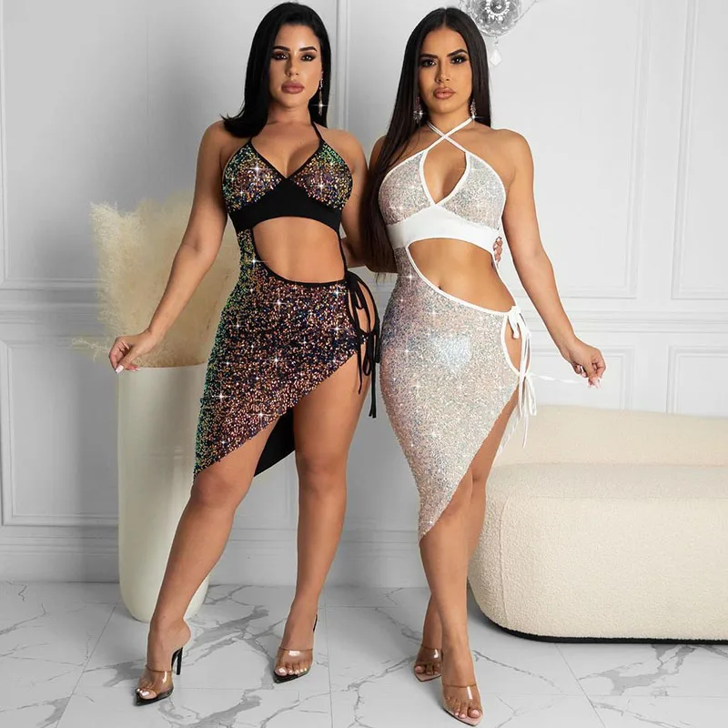 Сексуальное блестящее вечернее платье миди с блестками, женское облегающее платье с лямкой на шее и открытой спиной, асимметричные рождественские платья для ночного клуба