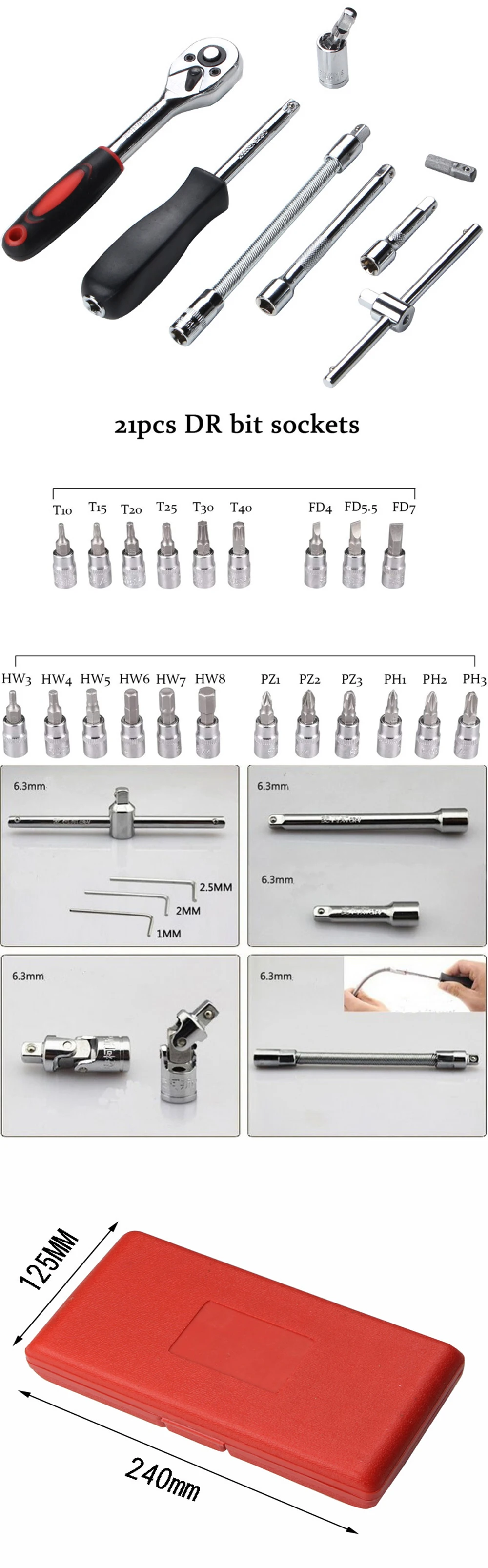 Спецификация:T10/T15/T20/T25/T30/T40H3/H4/H5/H6/H7/H8S4/S5.5/S7PH1/PH2/PH3PZ1/PZ2/PZ3Гнездо: соединитель1*1/4 ''Гибкая вертушка ручка1*1/4 ''вертушка ручка1*1/4 ''трещотка ручка2 * удлинитель: 2 ''+ 4''1 * универсальный шарнир3 * шестигранный ключ: 1,5-2-2,51*1/4 ''6'' эластичный стержень1 * AD Электрический шарнирХарактеристика:1. Прочный Материал: изготовлен из углеродистой стали для долговечности, не токсичен и не ржавеет.2. Портативный: все инструменты, содержащиеся в прочном, пластиковый чехол для удобства хранения и транспортировки, сохраняя инструменты и аккуратно и удобно для вас, чтобы получить доступ к инструмент, который вам нужен.3. Ручка гаечного ключа: с нескользящей ручкой для удобного, эргономичного захвата при использовании.4. Широкое использование: отлично подходит для большинства небольших ремонтов и основных DIY проектов дома, гаража и мастерской. Для ремонтников, строительных работников, механиков и так далее.