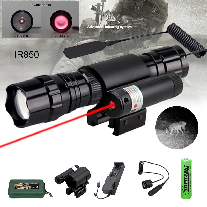 IR850nm масштабирусветильник охотничья вспышка ночного видения с инфракрасным излучением оружесветильник фонарь + красный лазерный точечный прицел + переключатель + 18650 + зарядное устройство