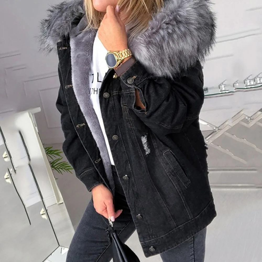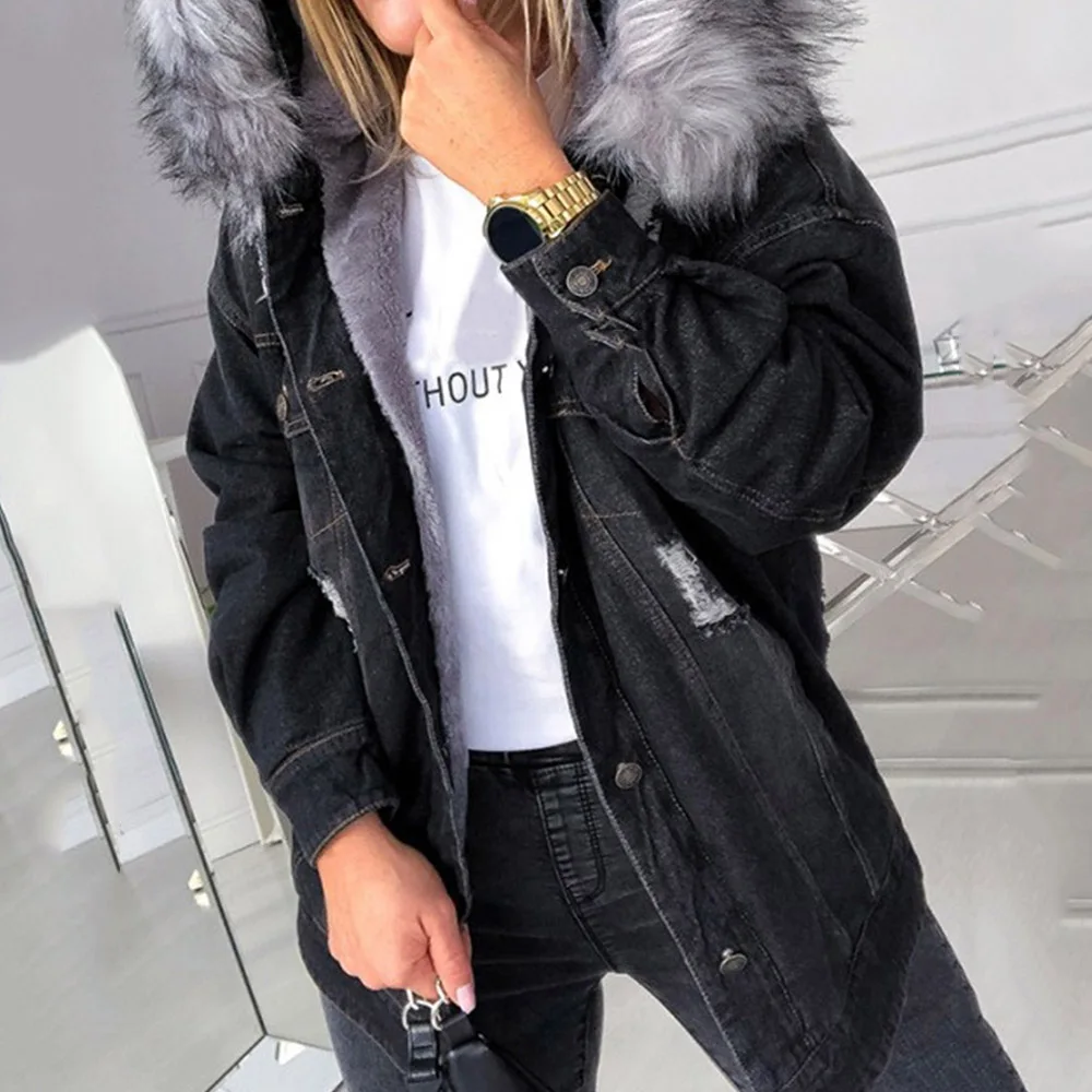 Женская зимняя джинсовая куртка с пушистым воротником и капюшоном, ...