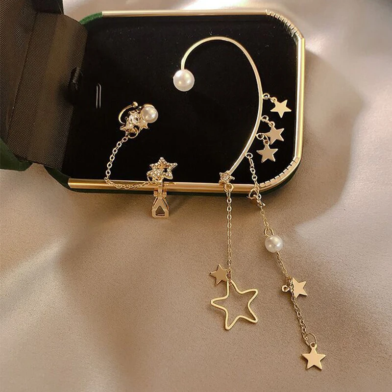 Винтажные Асимметричные жемчужные серьги-клипсы со звездами и кисточками для женщин, Длинные стразы, серьги со звездами, клипсы для ушей, трендовые ювелирные изделия 2021