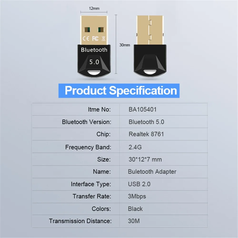 1.Mini USB Bluetooth-совместимый адаптер 5,0 с высокой скоростью до 3 Мбит/с.2. Bluetooth-совместимый беспроводной usb-ключ с низким энергопотреблением.3. Двухрежимная bluetooth-совместимая передача.4. Низкая мощность выбирается 1,2 до 3,6 VI/O.5. Поддержка голосовых данных, совместимых с Bluetooth.6. Поддержка нескольких языков.7. Совместим с Bluetooth-совместимым v1.2/2,0/2,1/3,0/4,0/5,0