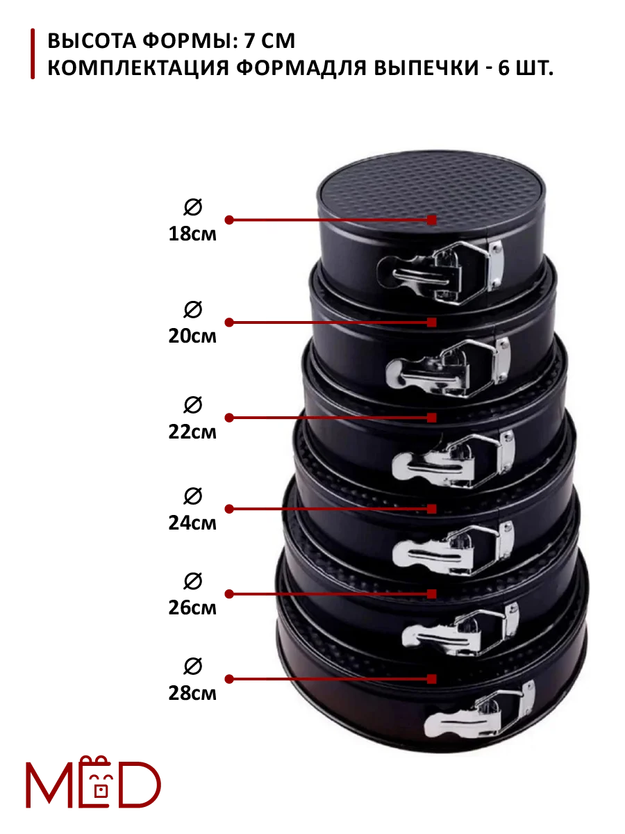Форма для выпечки поставляется набором. Представлено 6 разных диаметров, которые обязательно пригодятся в быту: 18, 20, 22, 24, 26, 28 см. Антипригарные формы для запекания удобно складываются одна в другую. Продуманный размер позволяет компактно хранить все емкости на кухне в шкафу.