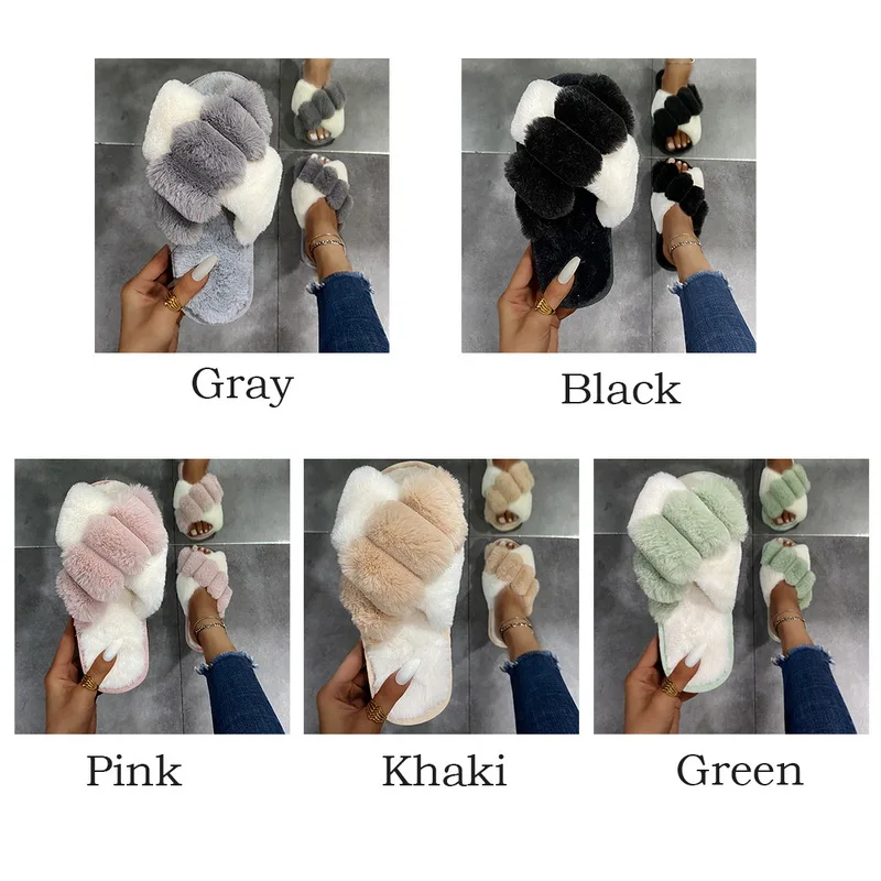 Теплые домашние Нескользящие плюшевые тапочки с перекрестными ремешкамиМатериал: верхний материал: замша; Материал подошвы: термопластичный каучук, теплый и удобный.Цвет: черный и белый, розовый белый, серый белый, бобовая паста белый, красный белый, желтовато-белый