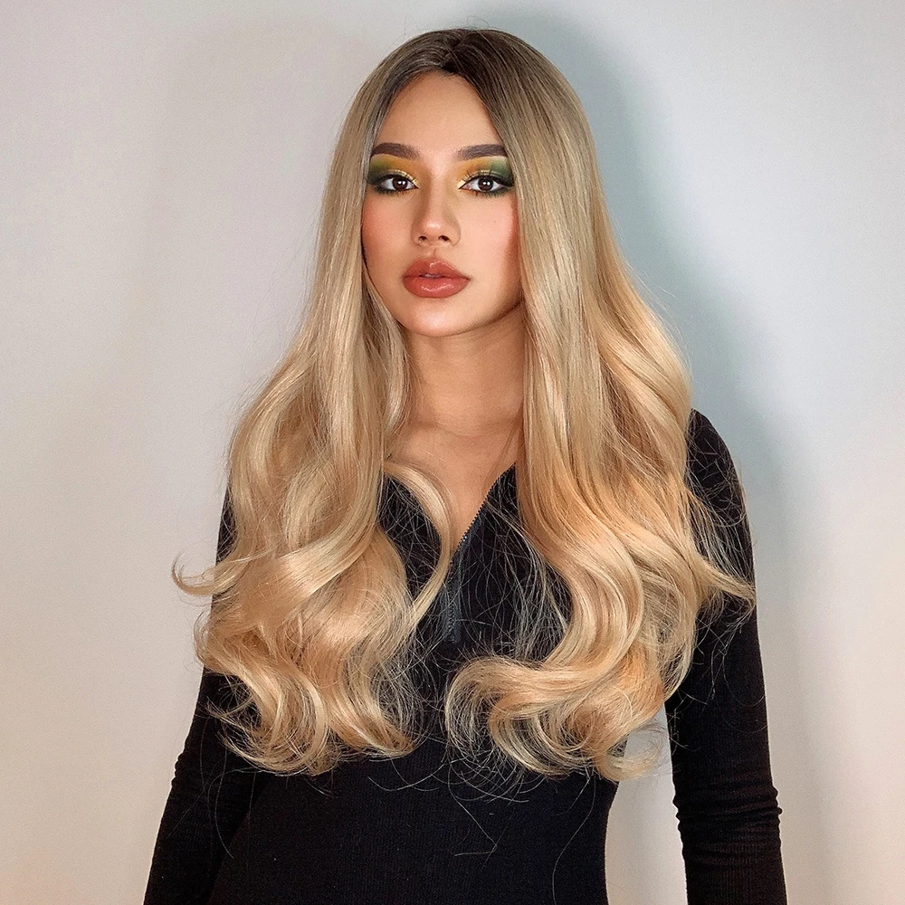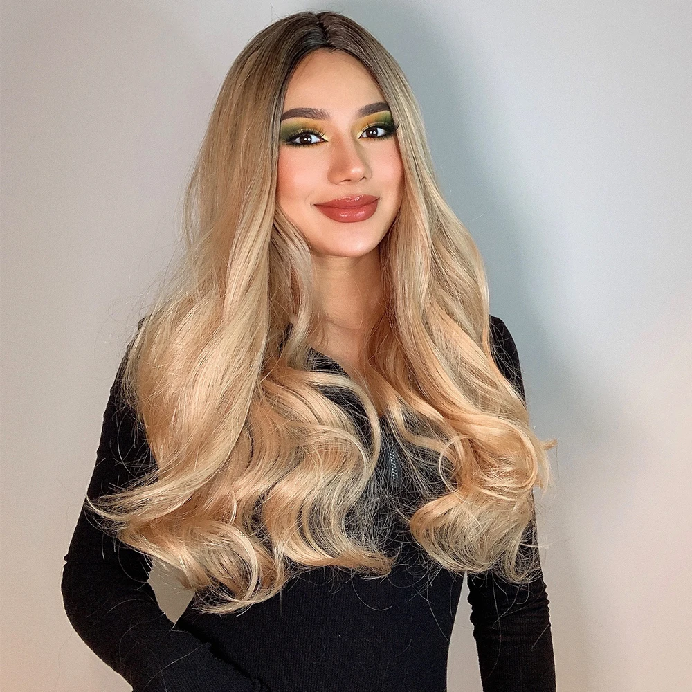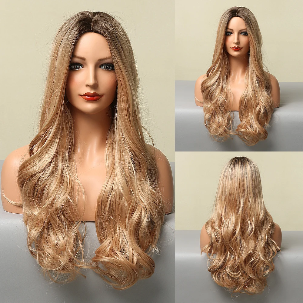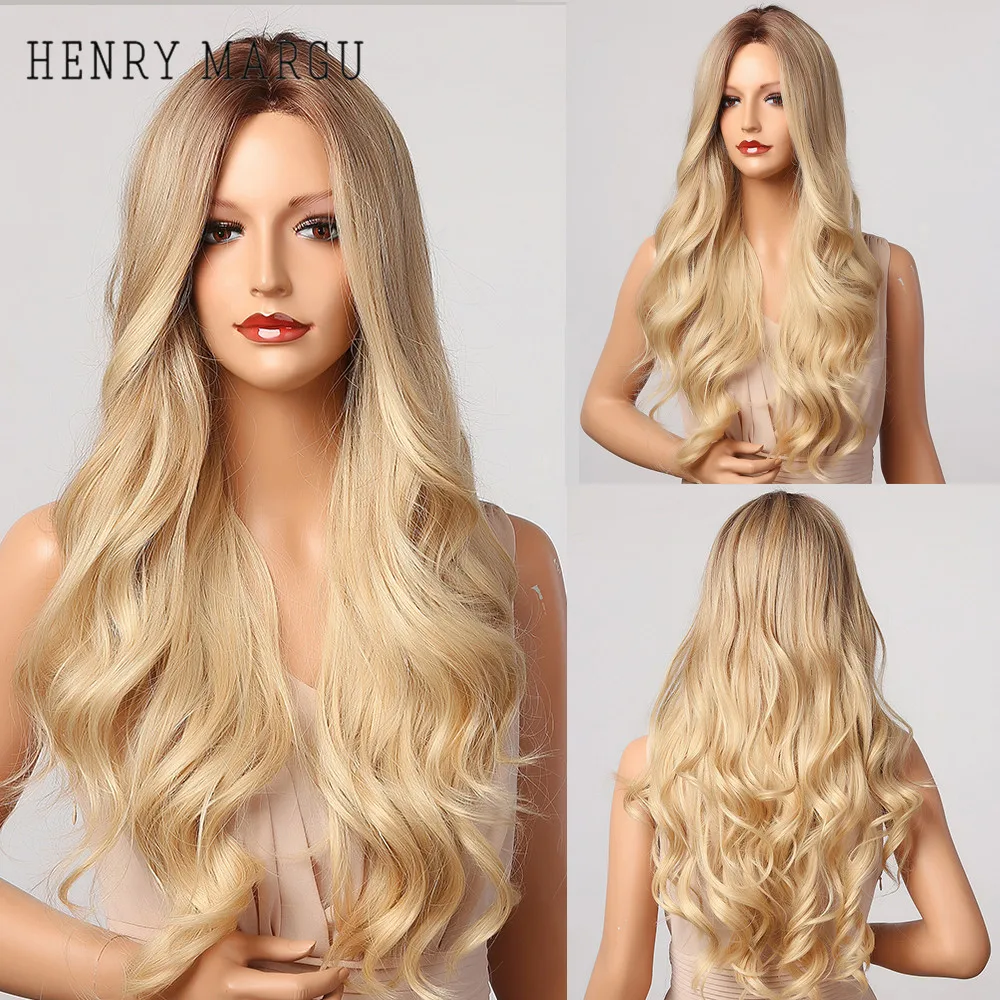 Женские натуральные длинные волнистые парики henmargu, парики с темными корнями, Омбре, коричневые, светлые, средней части, синтетические парики для косплея, вечеринки, повседневные искусственные волосы