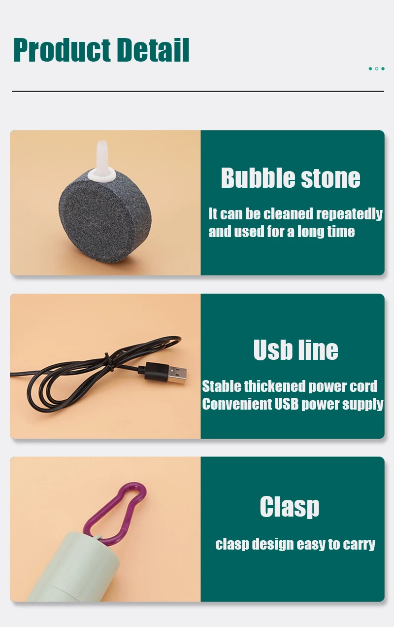 1. Энергосберегающие и бесшумные.2. Использование меди в качестве материала двигателя, производительность стабильна.3. Он используется для оксигенации в аквариумах, наружной рыбалки, подачи кислорода для морепродуктов и т. д.4. Источник питания USB, вы можете получить электричество через розетки, банки питания и автомобили.5. Оснащен воздушным камнем, объем воздуха Большой, стабильный и равномерный.6. 2 Воздушный камень аксессуар с регулирующим клапаном.