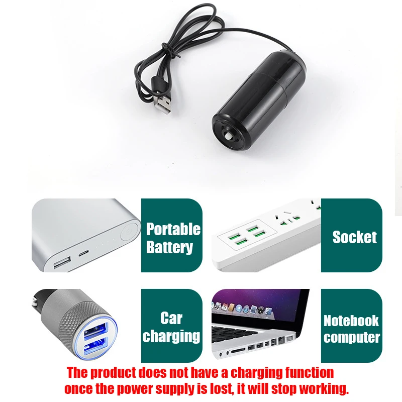 Размер: 8х3, 5 смЦвет: черный/белый/зеленый/розовыйМатериал: пластик + медьИсточник питания: USB 5v 1AМощность: 1 ВтДлина шнура питания: 90 смДлина воздушной трубки: 100 см