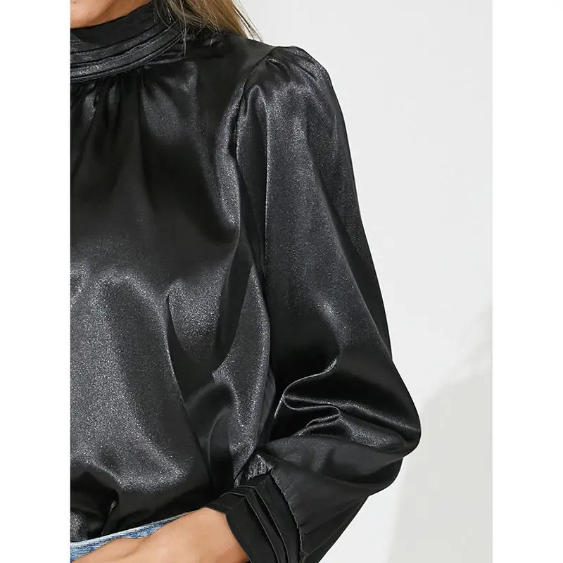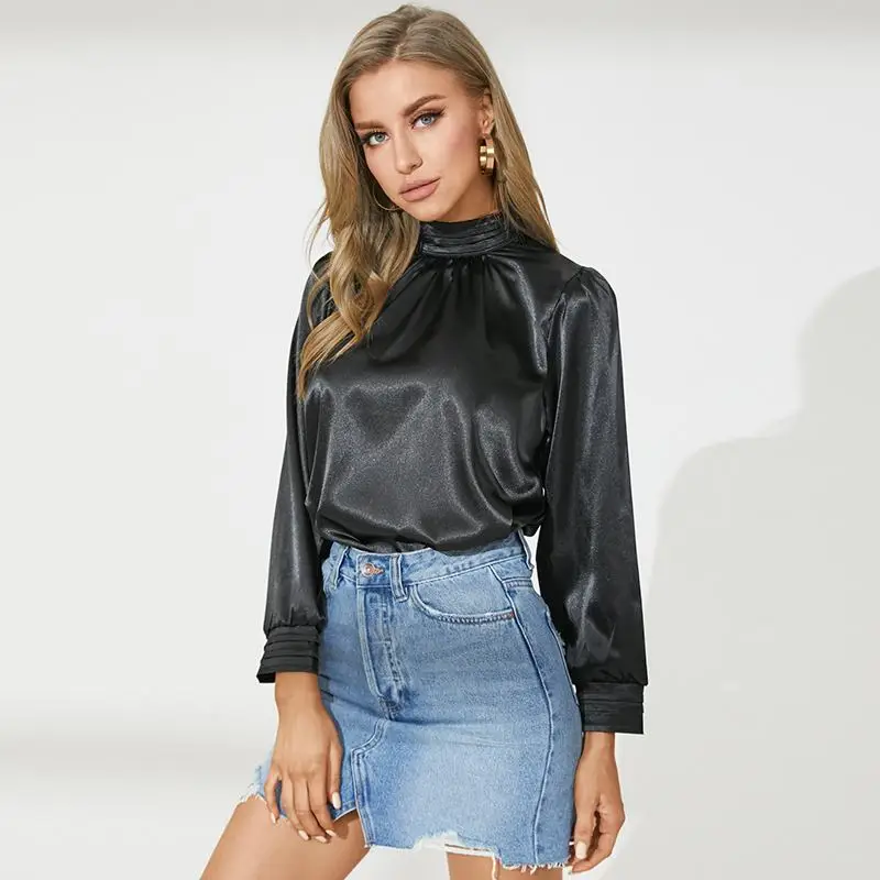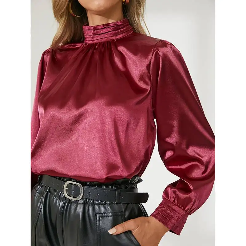 Женская атласная блузка, осень 2021, элегантный топ с высоким воротником, однотонные шелковые рубашки для вечеринок, блузы с рукавами-фонариками