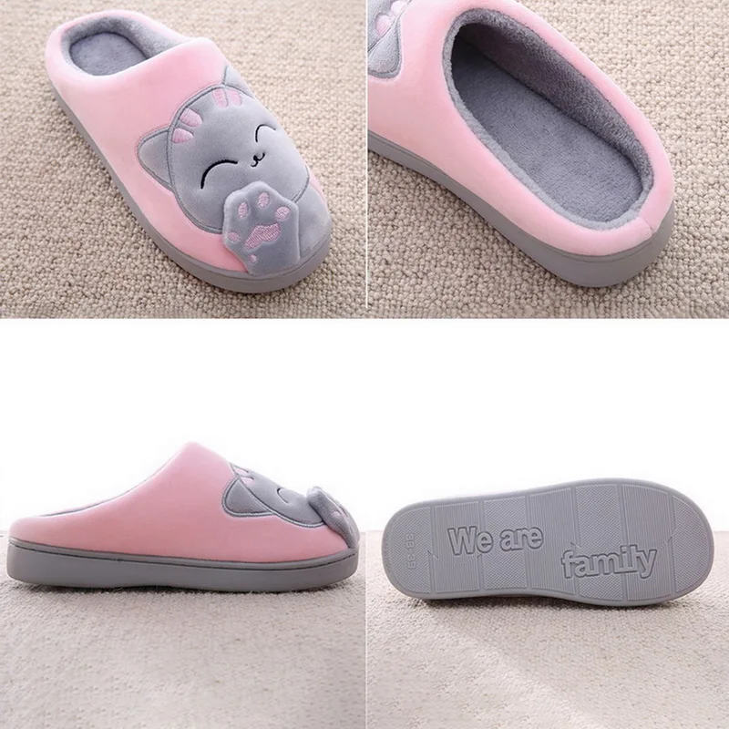 Новые стильные женские домашние тапочки для влюбленных, зимние Нескользящие мягкие зимние шлепанцы с мультяшным котом для спальни
