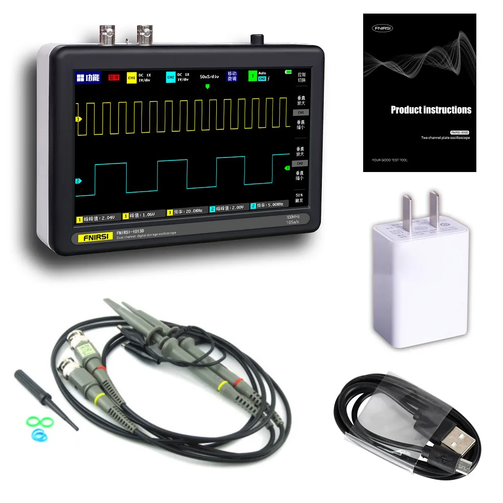 Посылка включает в себя:1 x FNIRSI-1013D хост осциллографа2 x подходящих зонда 100 МГц (1X и 10X)Зарядное устройство 5В 2A (включая usb-кабель передачи данных)-1 шт.Руководство пользователя (на английском языке)-1 шт.