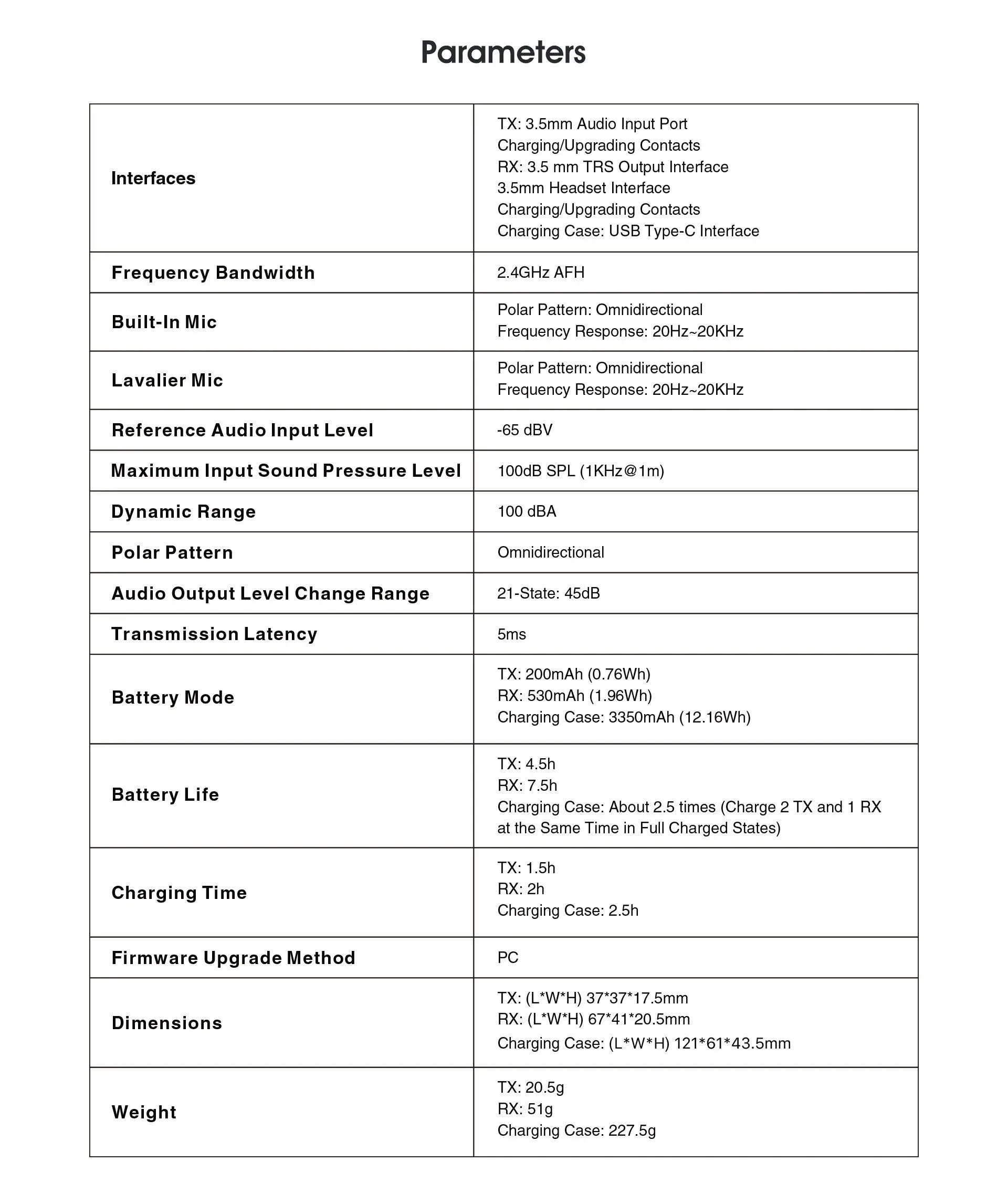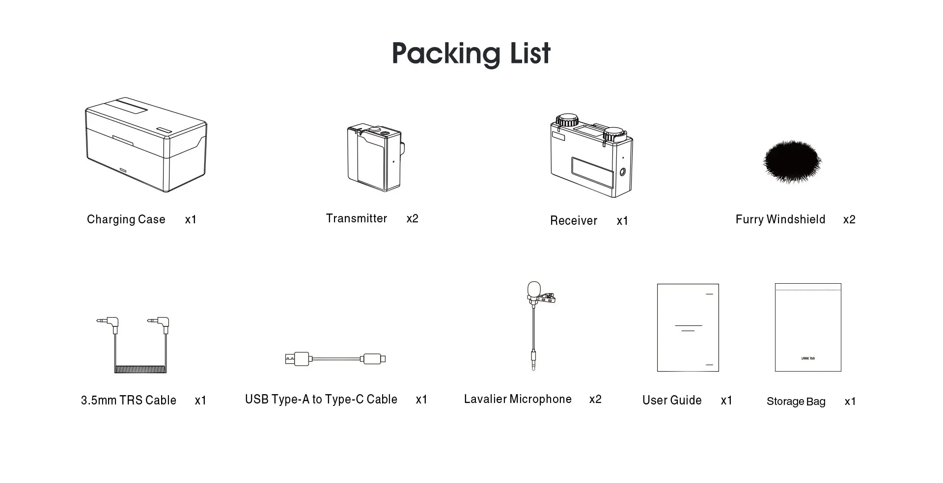 Зарядный чехол x 1Передатчик x 1Приемник x 1Пушистое лобовое стекло x 2Кабель TRS 3,5 мм x 1Кабель USB Type-A-Type-C x 1Петличный микрофон x 2Руководство пользователя x 1