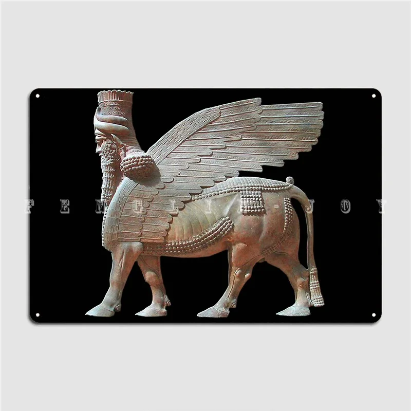 Статуя ассириана быка из крылатых голов Ассирии на черном плакате, металлическая настенная пещера, Настенный декор, оловянные плакаты с знаком