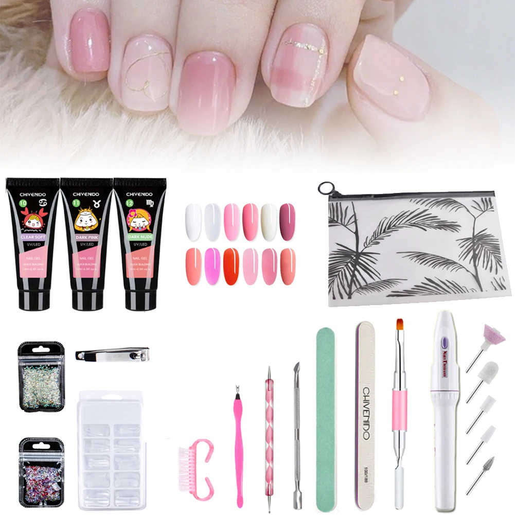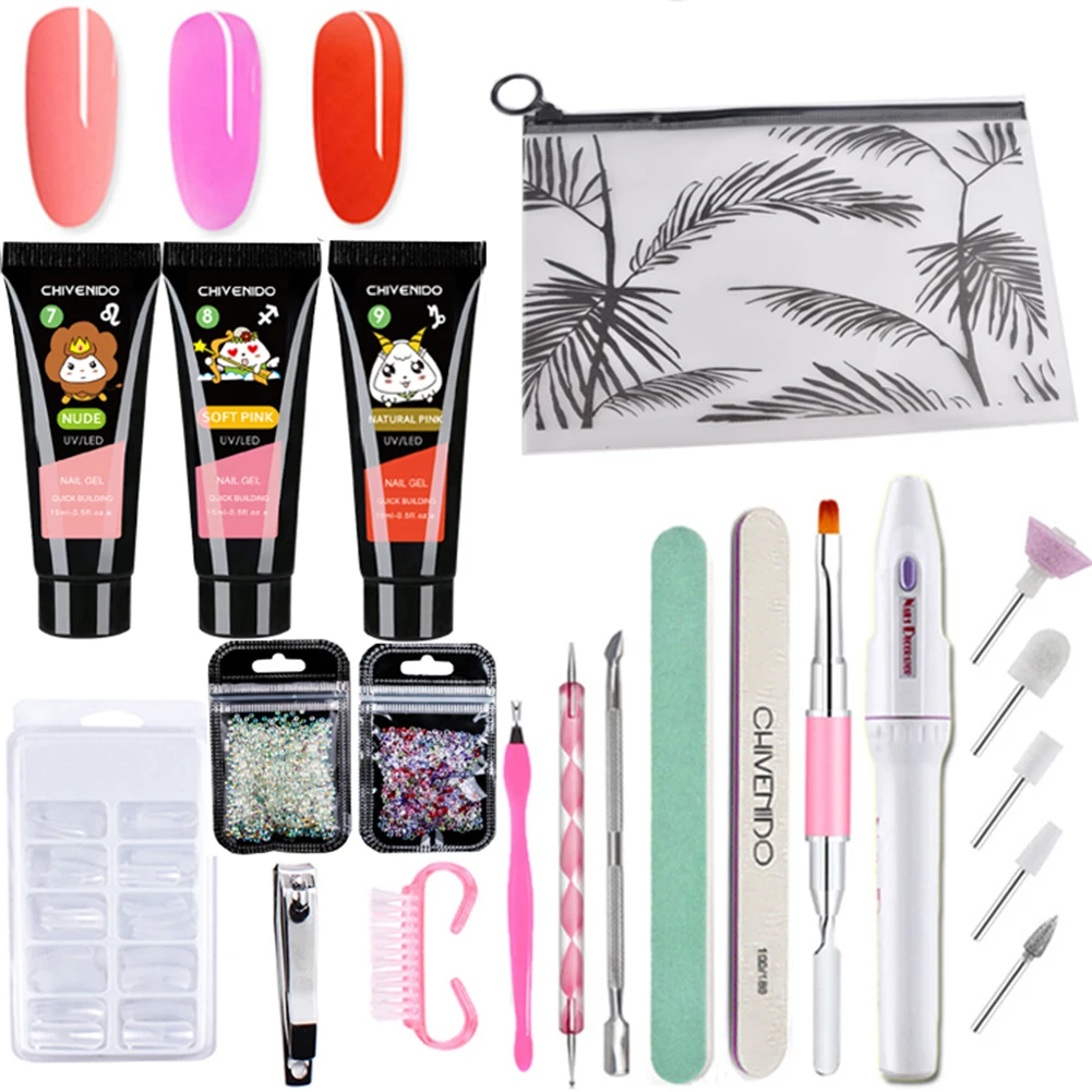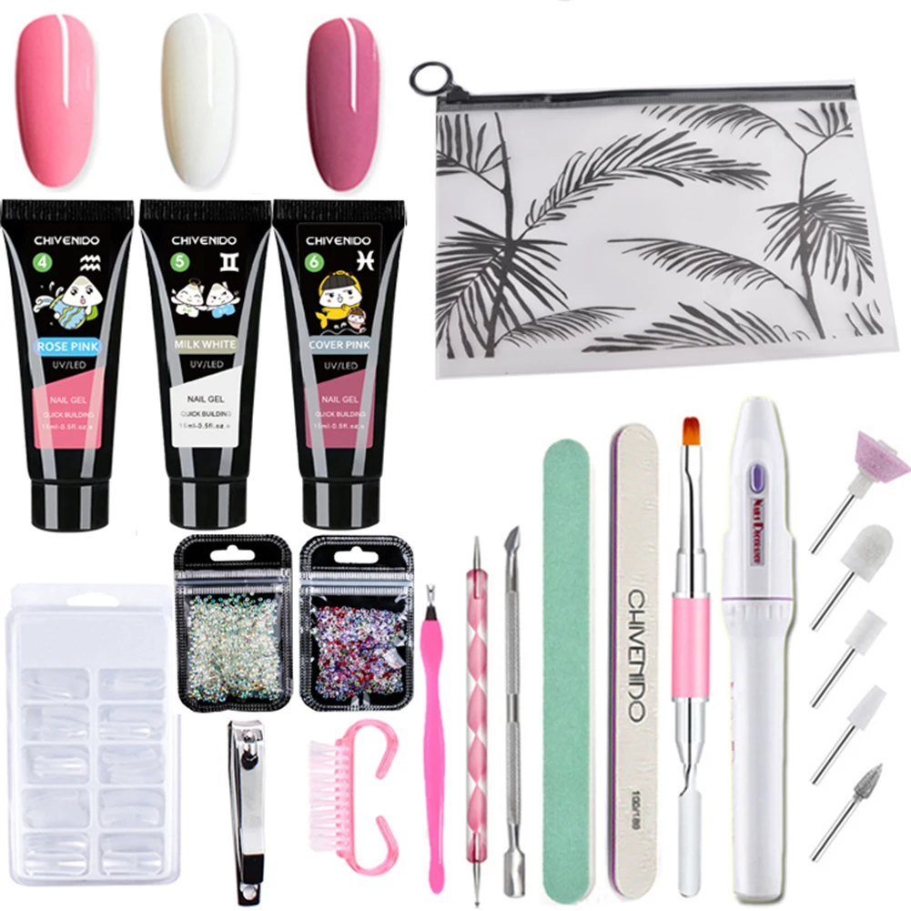 3x гель для наращивания, 2x Стразы для ногтей, 1x машинка для стрижки, 1x щетка, 100 шт. гвоздей, 1x вилка для омертвевшей кожи, 1x ручка для сверления, 1x стальное нажатие, 1x Полировочная полоса, 1x пилка для ногтей, 1 ручка для фототерапии,