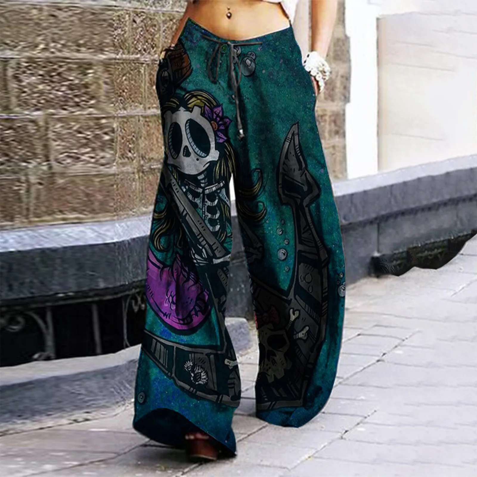 Женские винтажные повседневные свободные широкие брюки с принтом черепа на Хэллоуин