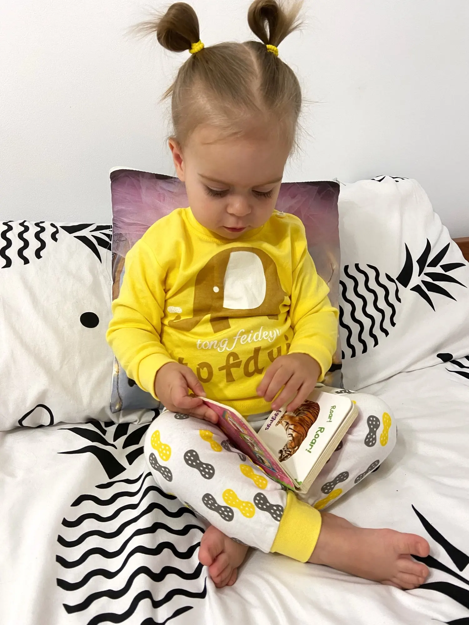 Пижамная чудесная. Приятный материал, Хлопковая. Очень комфортная. Ребёнок доволен. Принты яркие, После стирки не линяет. Точь-в-точь как на картинке. На ручках и ножках манжеты, Штанишки на резиночки не спадают. На одном плечике Пуговички, Чтоб комфортно было одеть ребёнку. Очень качественная. Берите не пожалеете, всем Рекомендую. Продавец отправил товар сразу, Был доставлен в течение трёх недель.