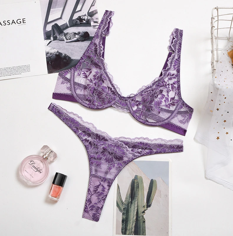Глубокий v-образный вырез, Цветочная вышивка, чувственный комплект женского белья, 2 предмета, нижнее белье, бюстгальтер Пуш Ап на косточках, прозрачные эротические короткие комплекты