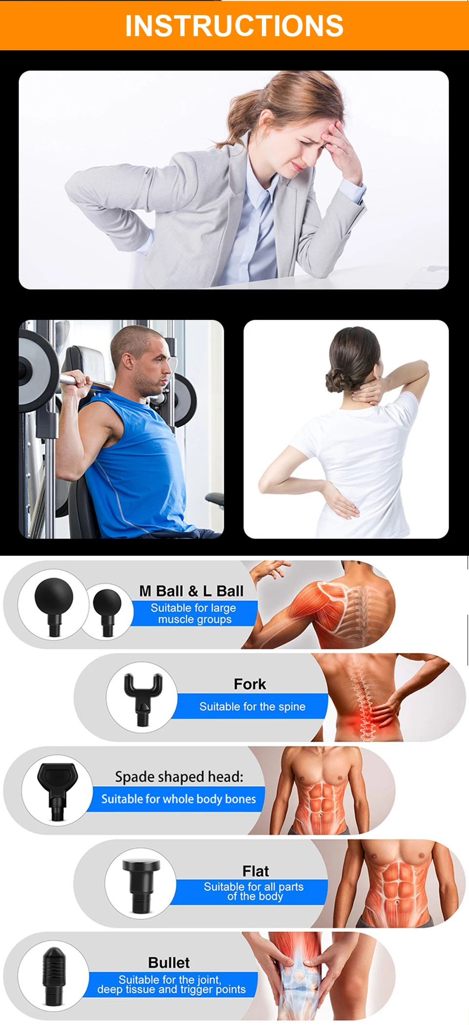 Сменные головки позволяют настроить ваш массаж. Округлые концы снимают напряжение в плечах и больших мышцах, в то время как пуля и вилка фокусируются на вашем позвоночнике и суставах.