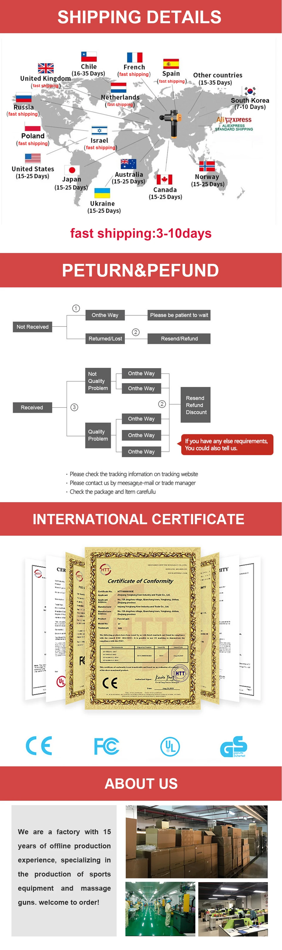 Посылка включает в себя:1 x массажный пистолет4 или 6 массажных наконечников1 x литий-ионный аккумулятор1 зарядное устройство1 х EVA коробка