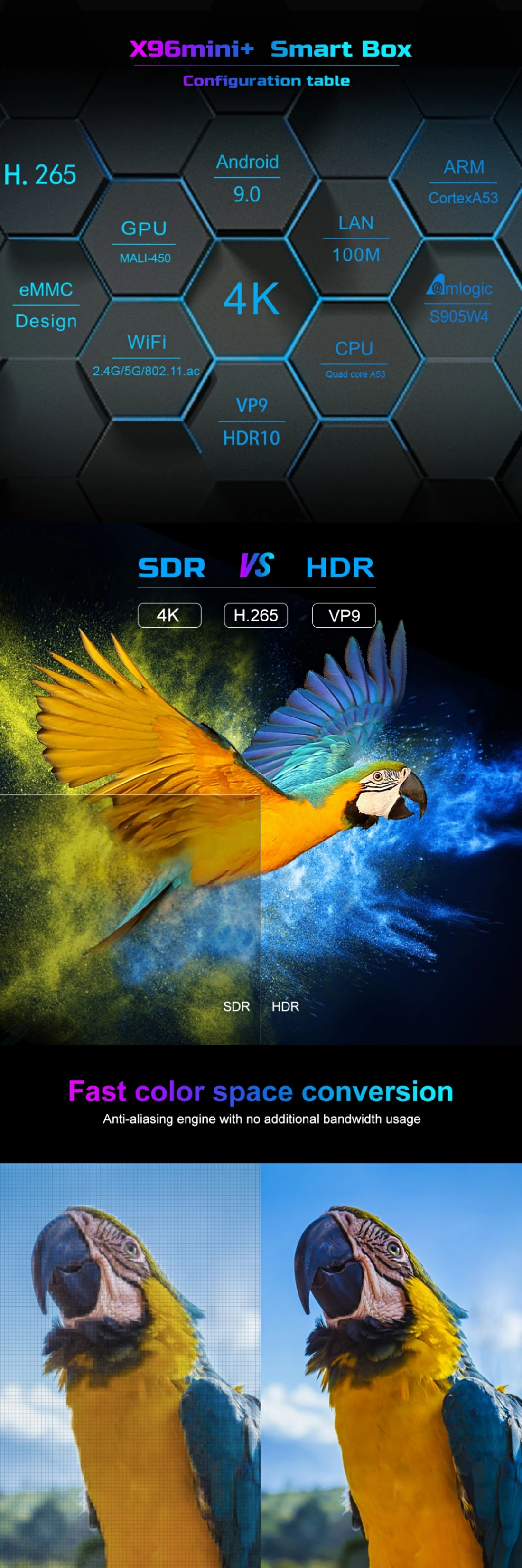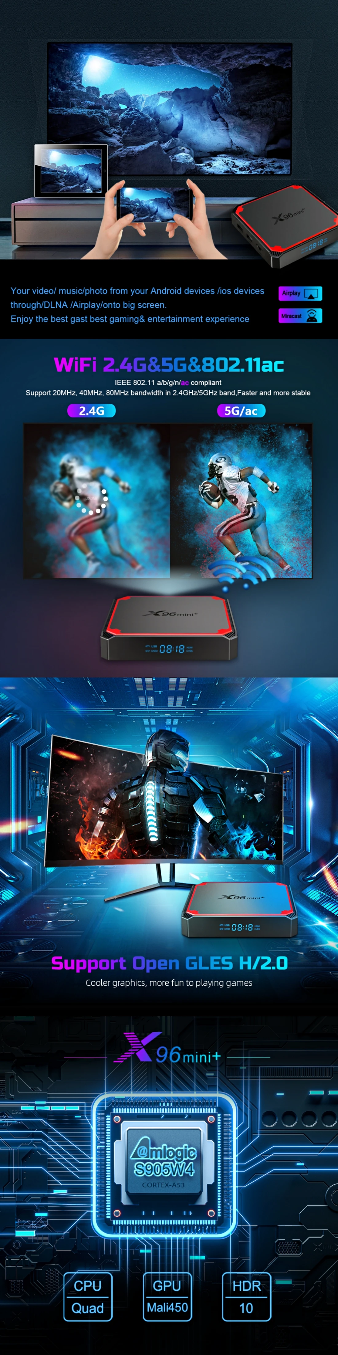 1, четырехъядерный процессор Amlogic S905W4 ARM Cortex A53;2. Графический процессор: ARM Mali-450MP;3, ОС Android 9,0;4, RAM/ROM: 1G/8G, 2G/16G;5, поддержка H.265, 4K, HDR,2xUSB2.0;6. Поддержка обновления прошивки онлайн (OTA).