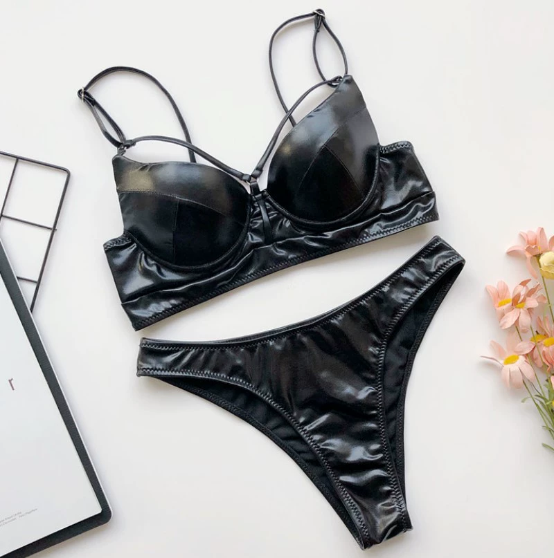 Соблазнительный комплект с бюстгальтером, женская одежда с накладкой на грудь, Т-образные трусики, Жесткая Сумка на косточках, красивый яркий бюстгальтер из искусственной кожи с разрезом, трусики