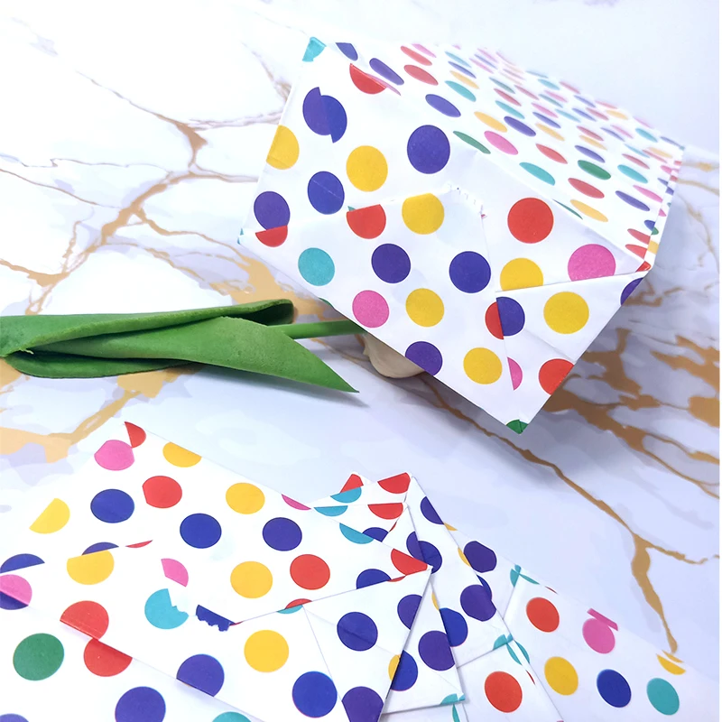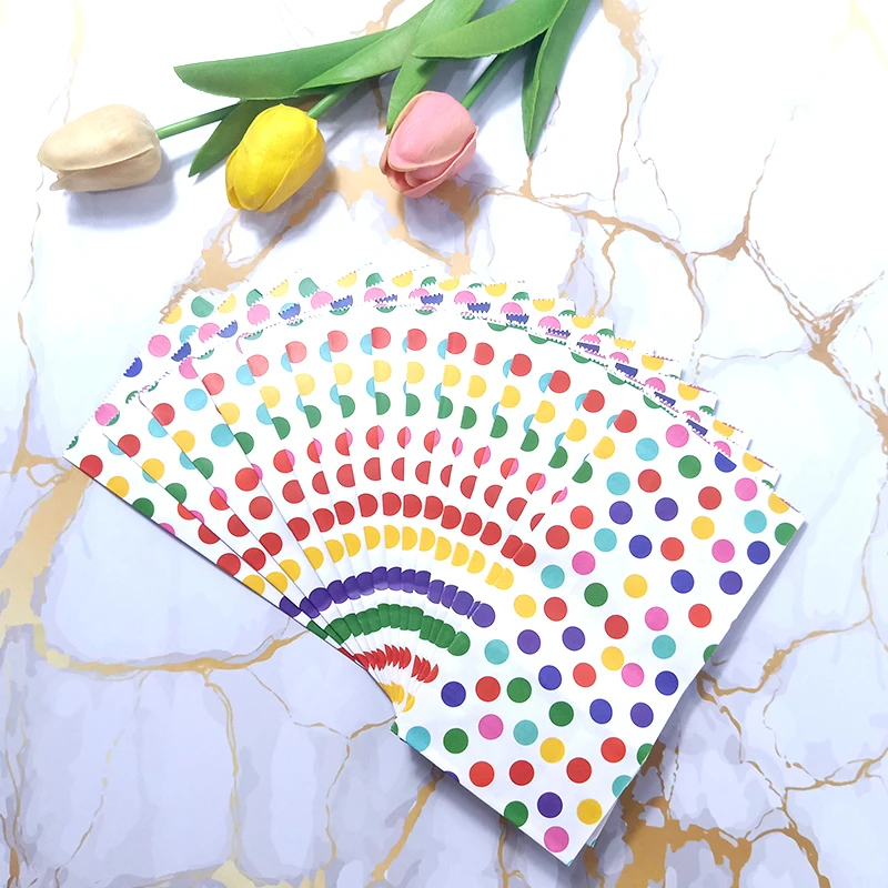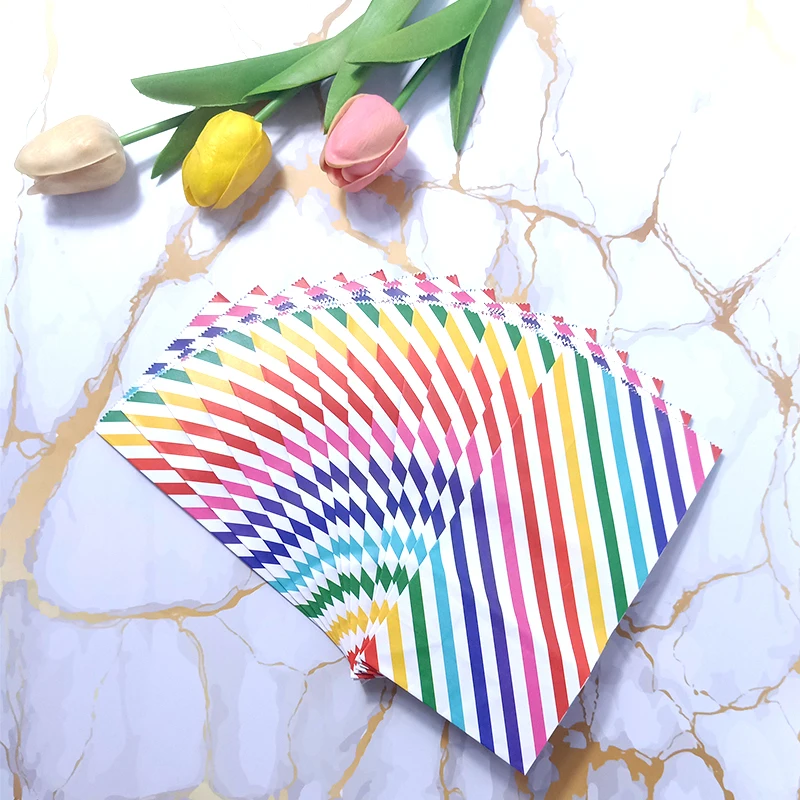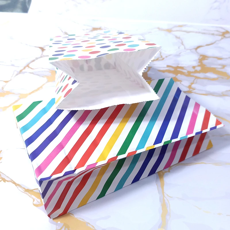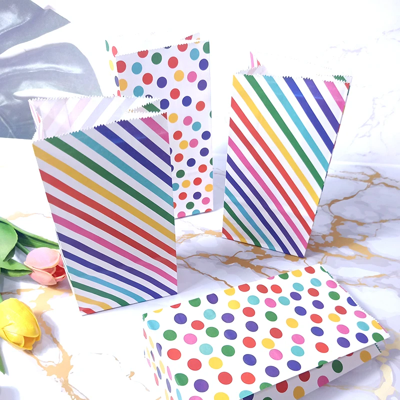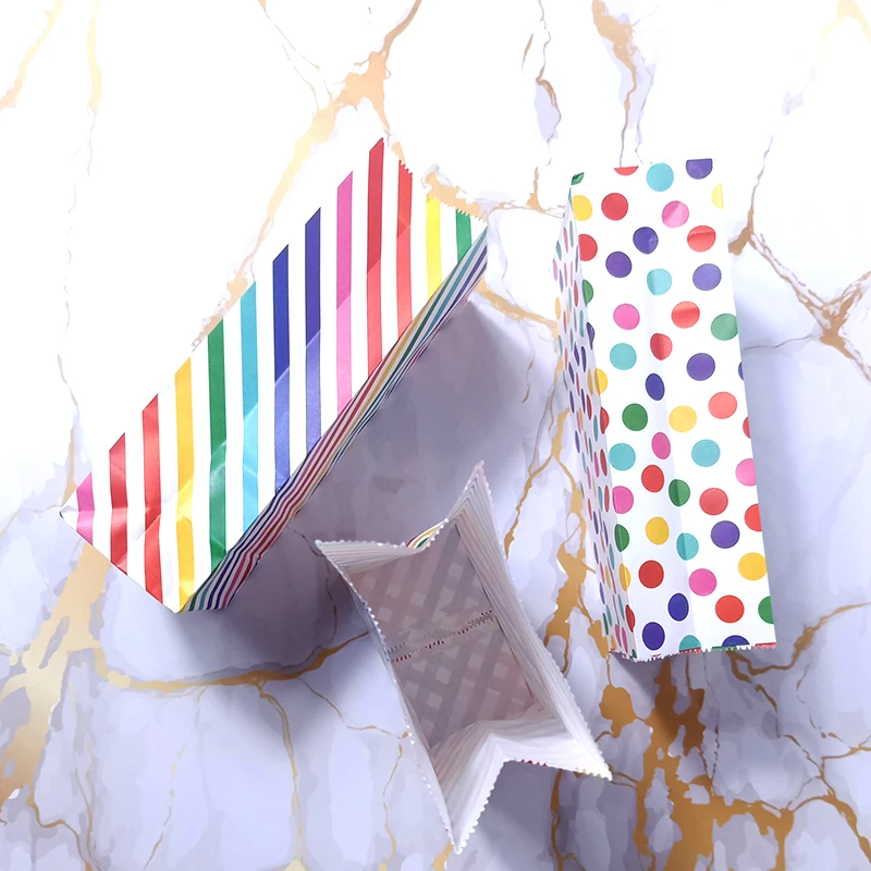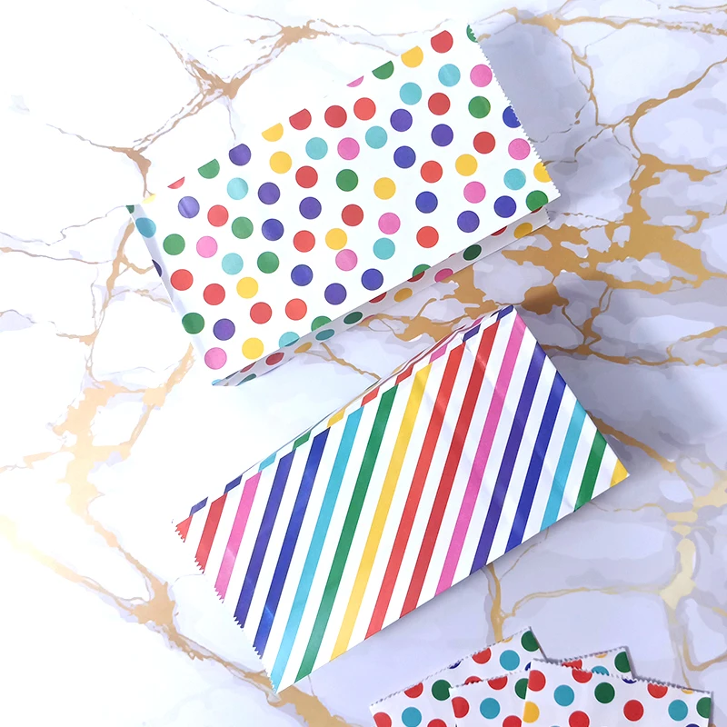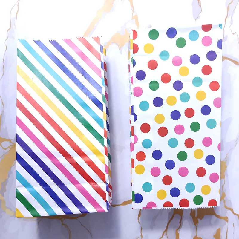 Название продукта: Радужная полосатая конфетная сумка в горошек, вечерние подарочные пакеты для сувениров, бумажные пакеты для выпечки своими рукамиМатериал: 80 г импортная крафт-бумага, УФ-печатьРазмер: один бумажный мешок размер 18x9x5.5cmИспользование: мешок конфеты/запеченный мешок еды/квадратный нижний пакет из жиронепроницаемой бумаги