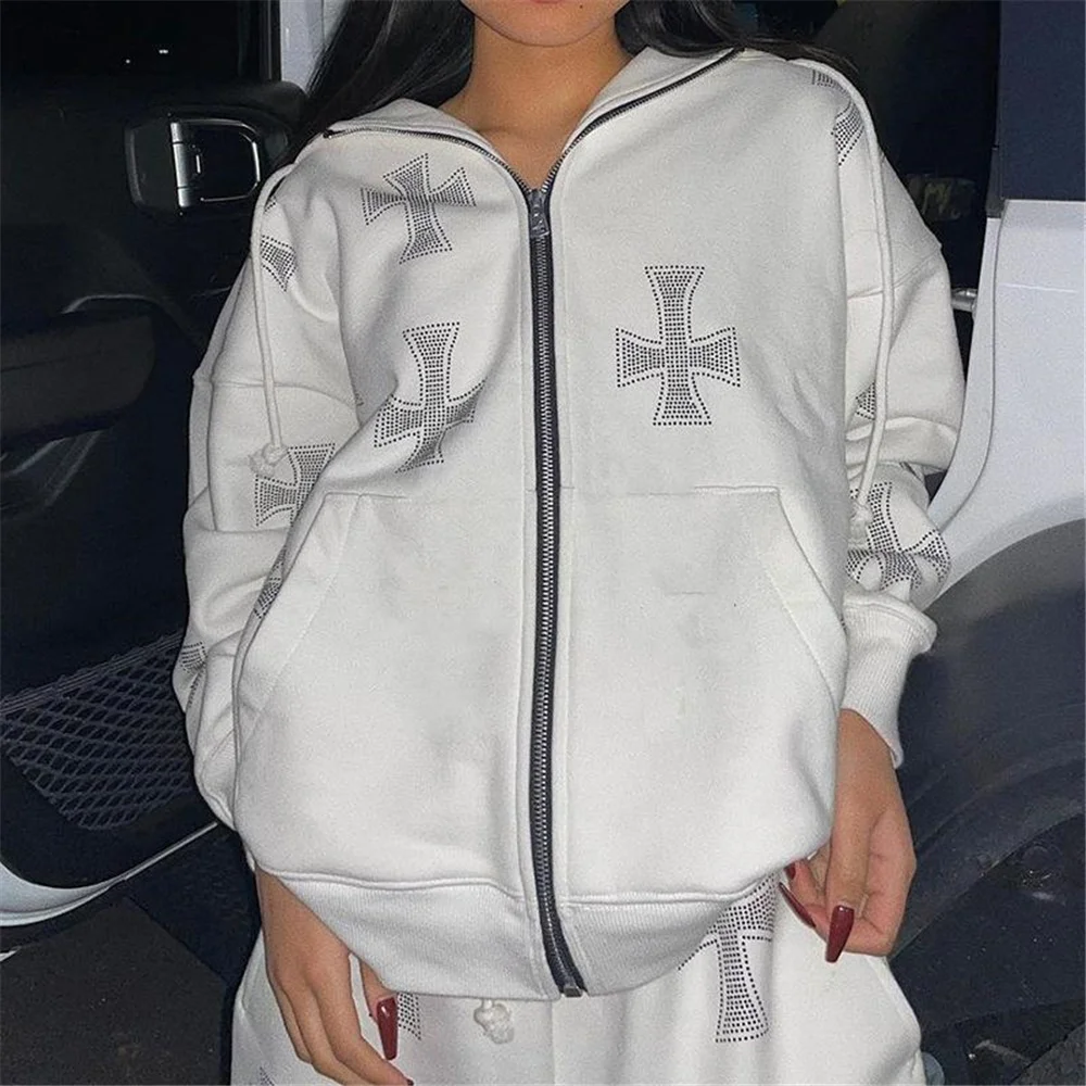 Y2K Стразы толстовки женские хип-хоп оверсайз Готическая молния с д...