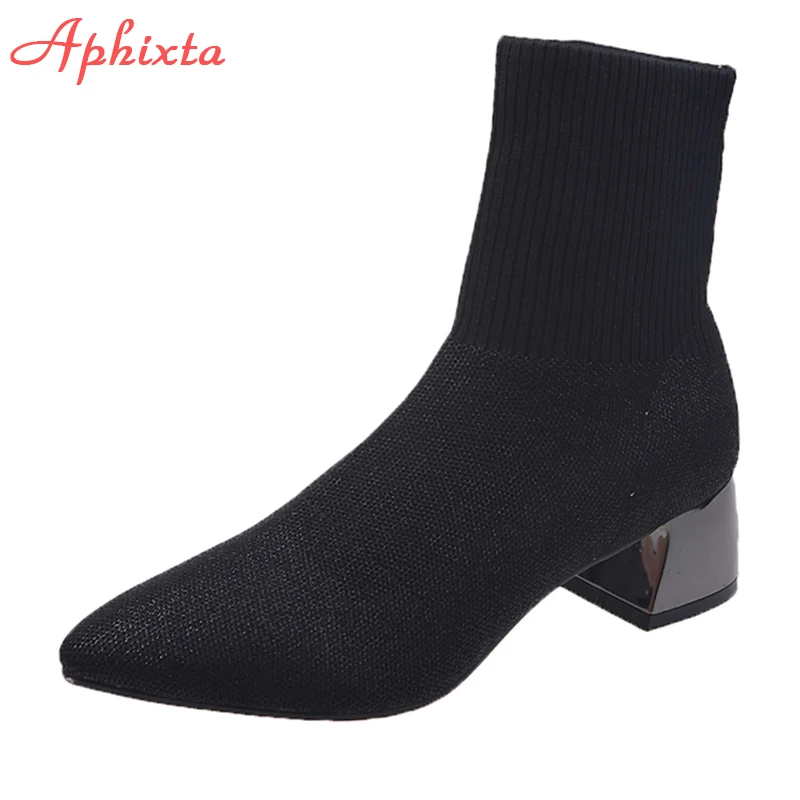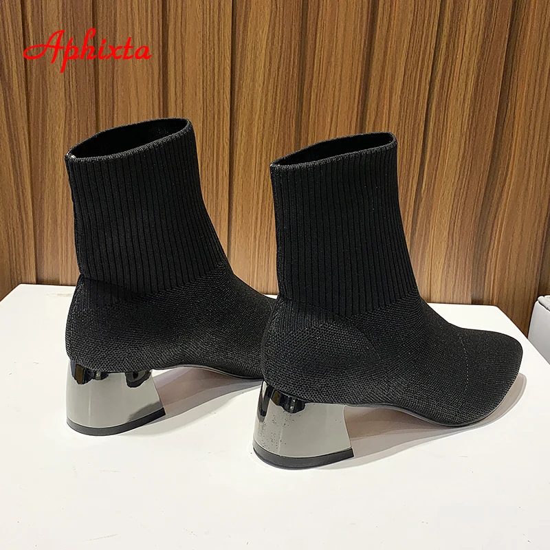Новинка 2021, блестящие женские ботинки-носки Aphixta, 6 см, на квадратном каблуке, стрейчевые, с острым носком, модные вязаные короткие ботильоны, обувь