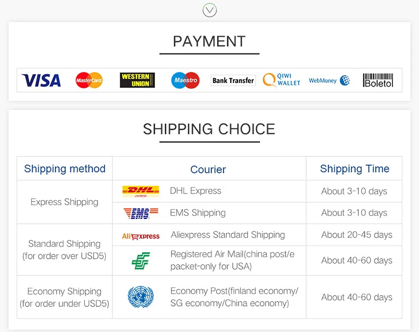 3. Для некоторых специальных стран, таких как Бразилия, Мексика, E-packet и Почта Китая, срок доставки может составлять около 20-90 дней