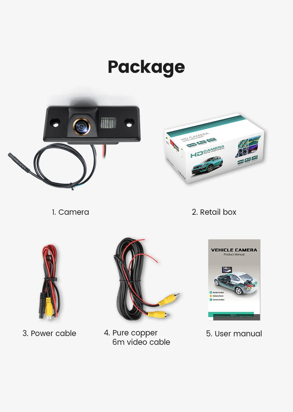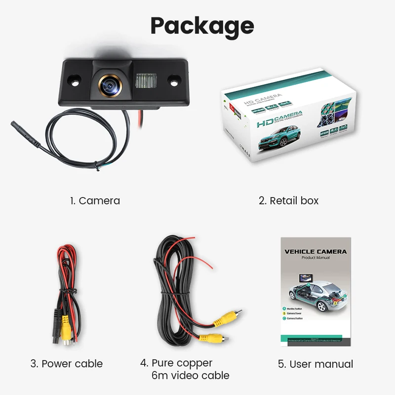 1. Камера заднего вида2. Розничная коробка3. Кабель питания4. Чистый медный 6 м видео кабель5. Руководство пользователя
