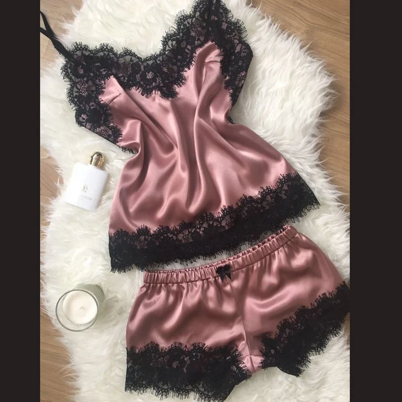 Женская пижама, Сексуальный Атласный пижамный комплект, Черная кружевная Пижама с V-образным вырезом, милый топ без рукавов и шорты