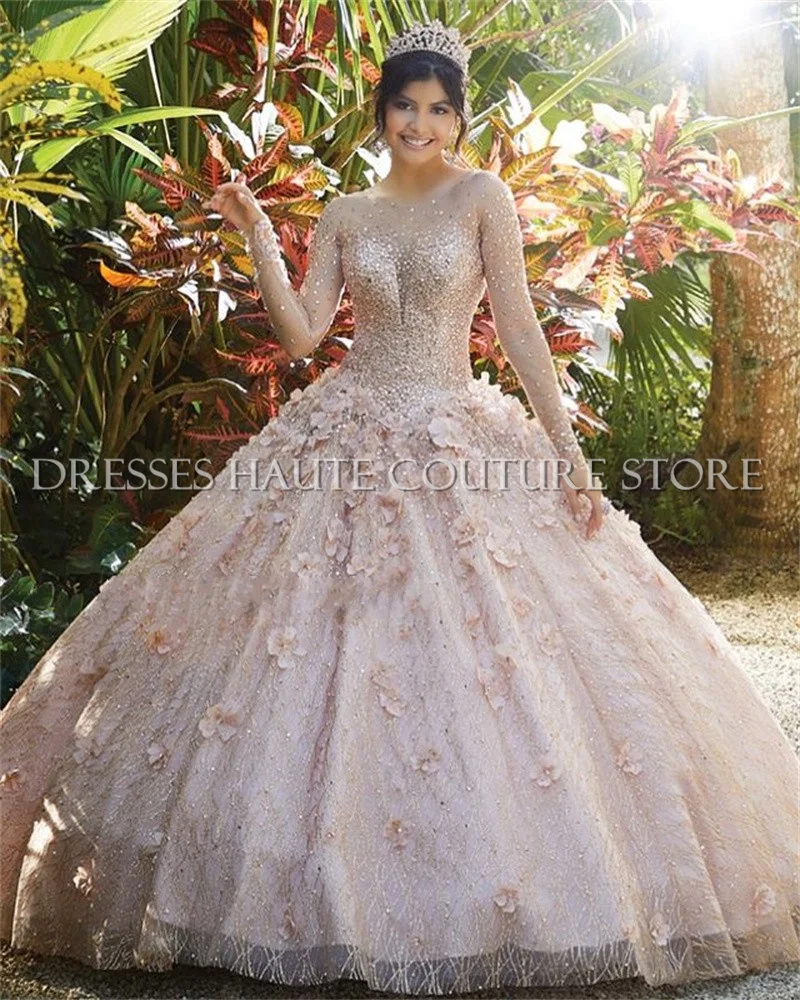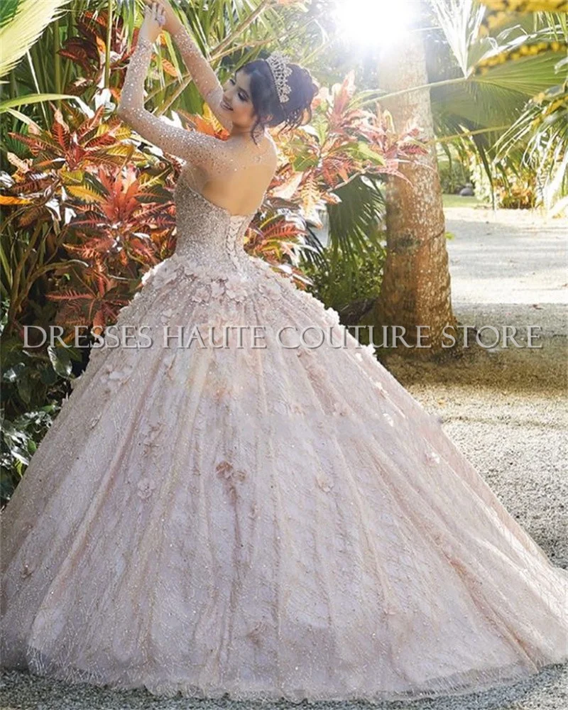 Женское Пышное Платье, розовое золото, с длинными рукавами и розовыми цветами, бальное платье для выпускного вечера, на шнуровке, с вырезом для ключа сзади, 2021