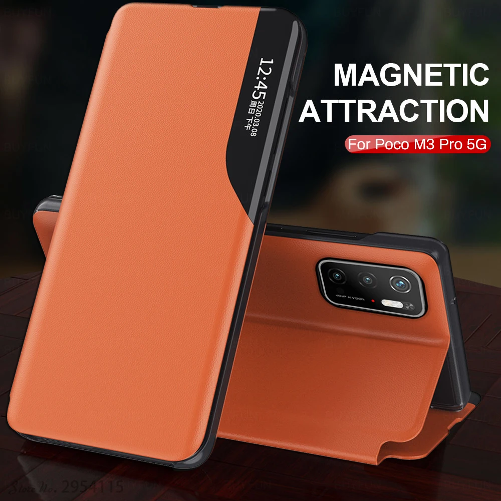 Кожаный смарт-чехол с окошком для просмотра сбоку для xiaomi little poko poco m3pro m3 pro 5g 6,5 ''магнитный держатель Чехол-книжка