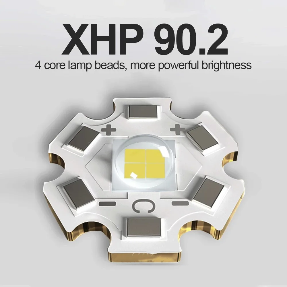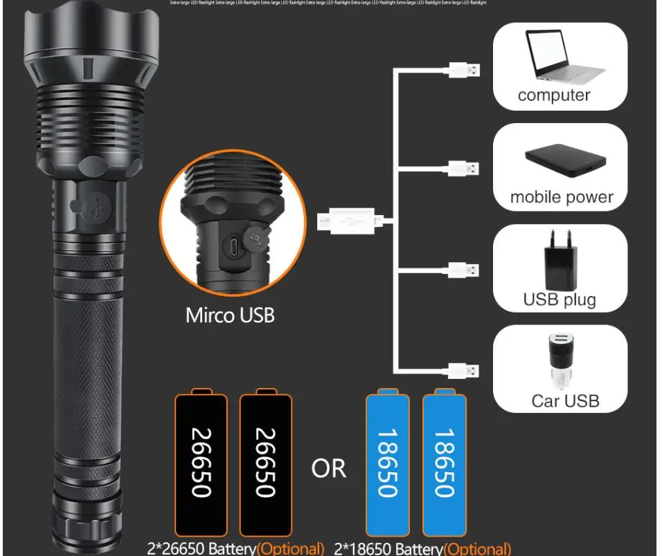 ★Светодиодный светильник: XHP90.2★3 режима: High-Low-SOS★Материал: алюминиевый сплав★Переключатель: нажмите переключатель★Режим зарядки: зарядка через USB★Расстояние освещения: выше 350 метров★Светодиодный срок службы: более 100000 часов★Аккумулятор: 2*18650/2*26650(Не входит в комплект)