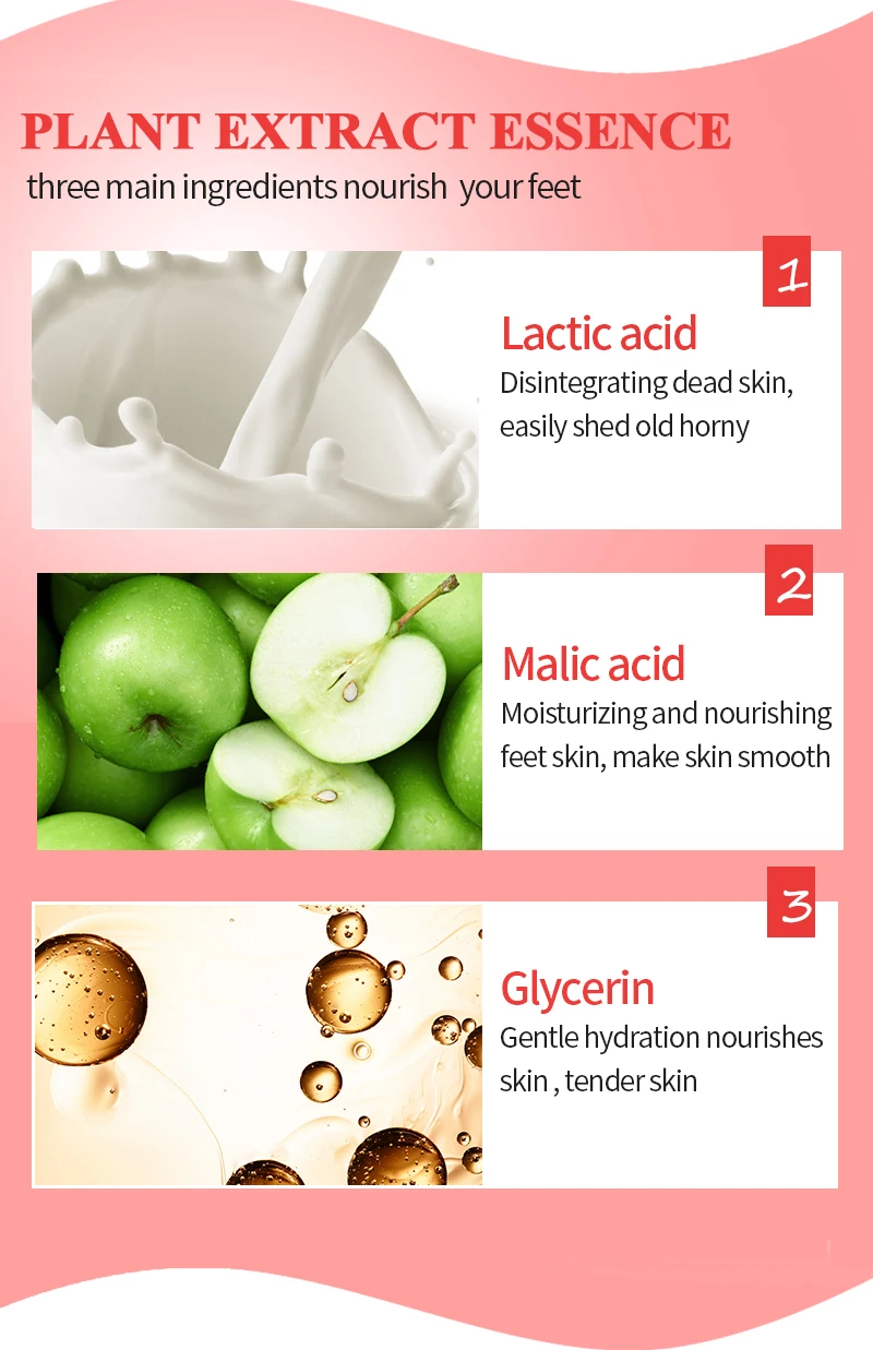 1. Вымойте и Замочите ноги горячей водой, а затем высушите ноги. 2. Используйте ножницы, чтобы вырезать Уплотнение Маски для ног посылка. 3. Носите маску для ног, мы рекомендуем носить пару нормальных носков снаружи, чтобы обеспечить достаточный контакт с эссенцией. 4. Снимите маску для ног через 35-95 минут, затем очистите ноги. 5. Большинство людей начинают очищать омертвевшую кожу после 48 часов использования, но из-за различных типов кожи кому-то может потребоваться 2-3 пары, пожалуйста, используйте маску для ног снова 48 часов позже. 6. Не используйте маску, если у вас есть активный порез или ран. 7. Мы предлагаем вам замочить ноги горячей водой после 48 часов использования.