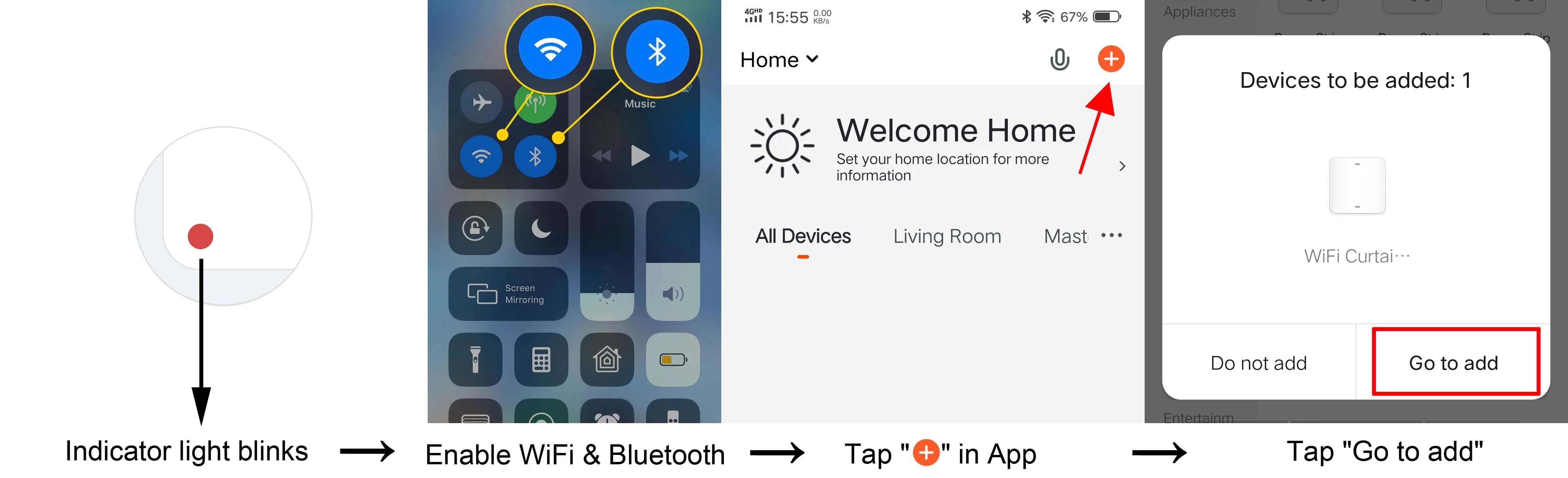 Включите телефон, Wi-Fi и Bluetooth, а также проследите за индикатор светильник-это быстро мигать, откройте приложение, нажмите «Добавить устройство» или «+», несколько секунд позже, приложение будет всплывающее окно, нажмите «перейти, чтобы добавить», чтобы добавить устройство. Затем выполните шаги в приложении.