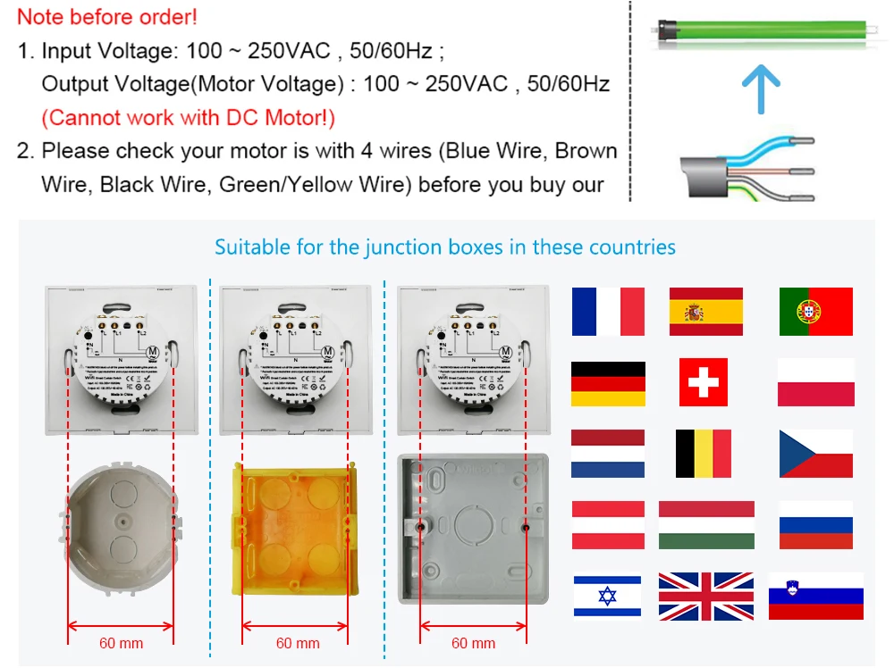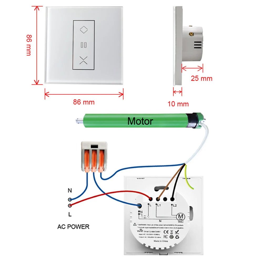 Обратите внимание, что для вашего двигателя требуется по крайней мере 3 провода, провод 1, провод 2 (для открытия и закрытия) и нейтральный провод, в противном случае он не может быть подключен к двигателю, выключатель может быть совместим с любым мотор для рольставни с электроприводом с входом напряжения 100-250 В переменного тока, макс. 600 Вт. Как Somfy, Dooya, A-OK и т. Д., но нейтральный провод должен быть необходим для установки.* Подключение по Wi-Fi: 2,4 ГГц только (не совместим с Wi-Fi 5 ГГц)