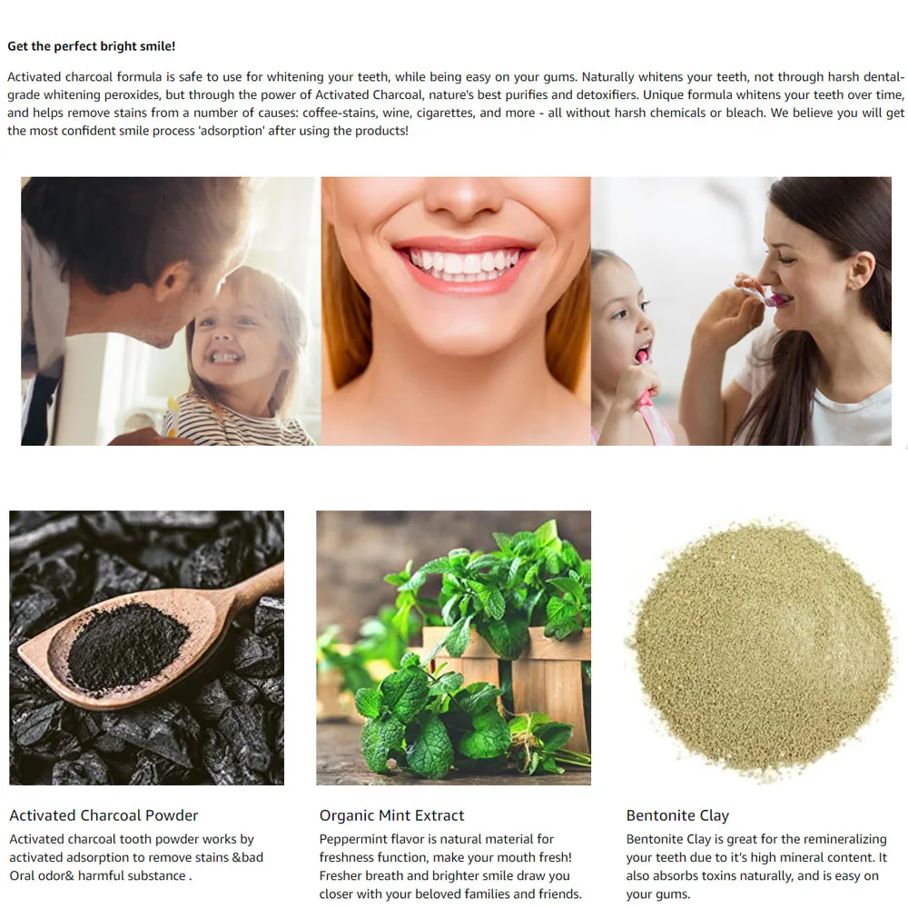 Формула активированного угля безопасна в использовании для отбеливания зубов, при этом легко воздействует на десны. Естественно отбеливает ваши зубы, не благодаря жестким пероксидам отбеливания зубов, а благодаря силе активированного угля, природа лучше всего очищает и детоксицирует. Уникальная формула с течением времени отбеливает зубы и помогает удалить пятна от целого ряда причин: пятна от кофе, вина, сигарет и многого другого-без жестких химикатов или отбеливателя. Мы уверены, что вы получите самый уверенный процесс «адсорбции» после использования продуктов! Получите идеальную Яркую Улыбку! Спецификация: -100% Новинка и высокое качество -Бренд: VACLAV -Модель: 1705 -Цвет: черный -Емкость: 30 г -Основной ингредиент: активированный уголь -Подходит для взрослых -Эффективность: яркий белый цвет, удаление накипи, Предотвращение неприятного изо рта, подавление зубного налета, профилактика заболеваний периодонта, удаление неприятного изо рта, свежесть зубов Посылка 1 * Бамбуковый зубной порошок Как использовать? 1. Добавьте небольшое количество порошка в ладонь, используя небольшую ложку 2. Смочите щетину зубной щетки, окуните ее в угольный уголь 3. Аккуратно почистите внутреннюю, внешнюю и жевательную поверхность зубов в течение 1-2 минут. 4. Нанесите краску водой, после очистки и наслаждайтесь потрясающим хорошим результатом