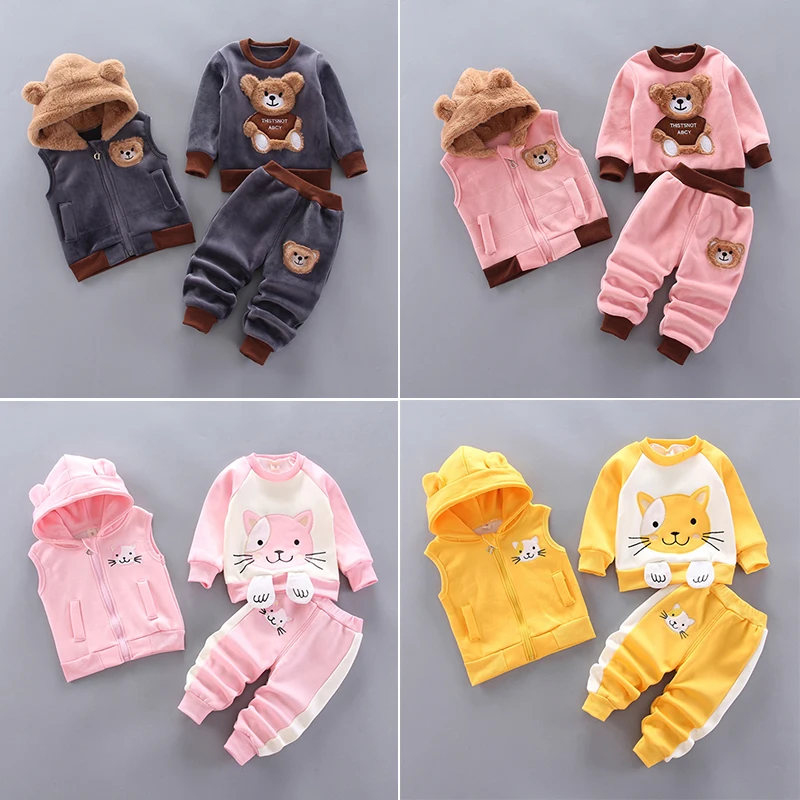 Осенне-зимний комплект одежды для маленьких мальчиков с мультяшным медведем, жилет с капюшоном + пальто + штаны, костюм для девочек из 3 предметов, костюм маленькой принцессы, детская одежда