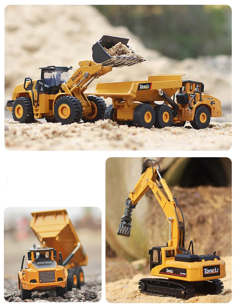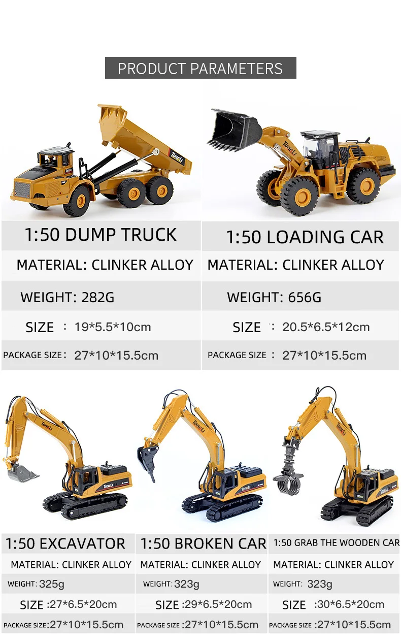 Описание:7 стилей профессиональных моделей моделирования изготовлены из литого металла.Экскаватор/буровой экскаватор/дорожный каток/шарнирный грузовик/бульдозер/вилочный погрузчик