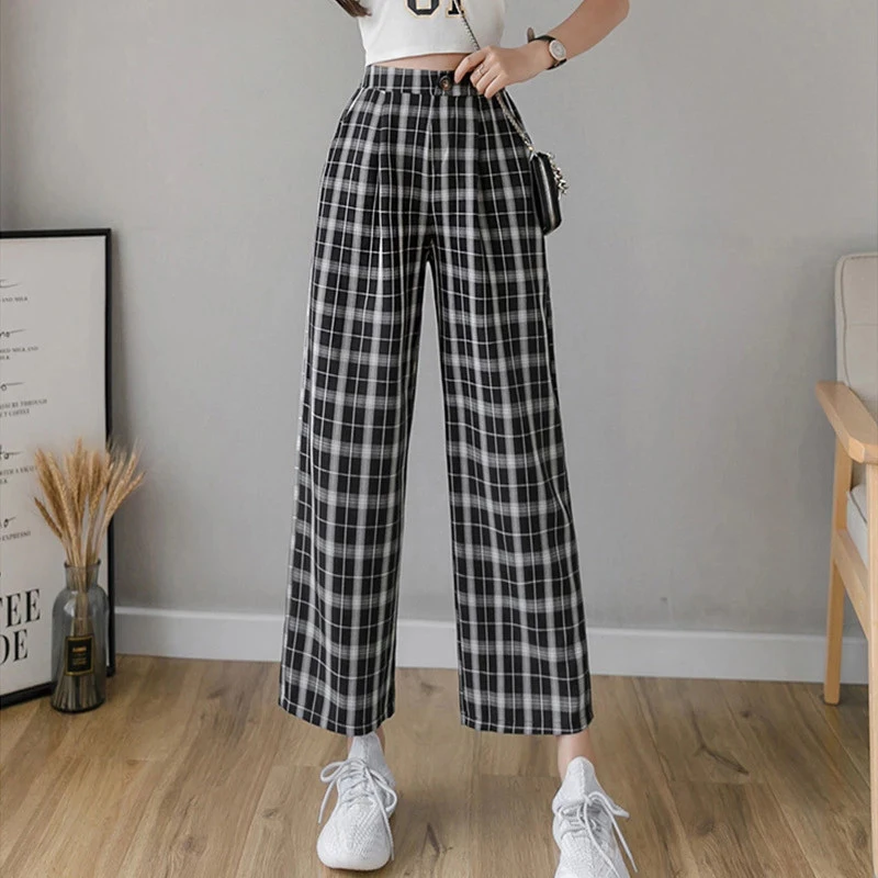 Женские винтажные клетчатые брюки, повседневные широкие брюки в Корейском стиле с высокой талией в стиле Харадзюку, 2021