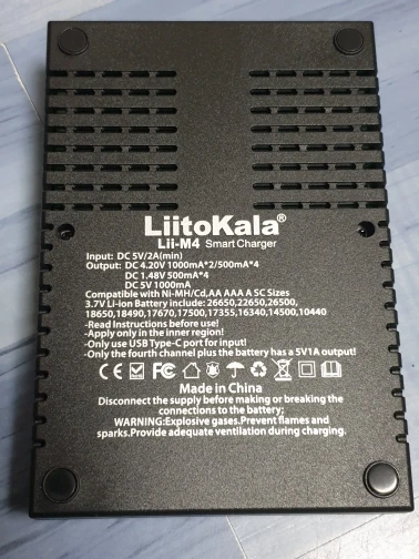 Бренд: LiitoKalaМодель: Lii-M4Входное напряжение: 5 В/2 а постоянного токаВыход напряжение: DC 4,2 V / DC 1,48 V/3,65 V DC/DC 4,35 V / 5VВыходной токТок зарядки литиевой батареи:500мА * 4/1000мА * 2NiMH ток зарядки аккумулятора: 500 мА * 4Выходной ток USB 5 В: 1000 мАХарактеристики аккумуляторной батареи: 26650,21700,18650,18350, 20650,14500, AA, AAA, C,SC и т. д.Метод прерывания: Интеллектуальный контроль напряженияРазмеры: 146 мм (длина) * 100 мм (ширина) * 33 мм (высота).