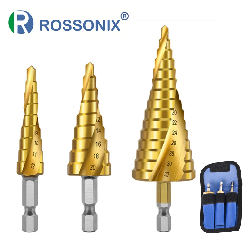 Набор ступенчатых сверл ROSSONIX, комплект из быстрорежущей стали с титановым покрытием, для работ по металлу и дереву, 4-12 мм 4-20 мм 4-32 мм