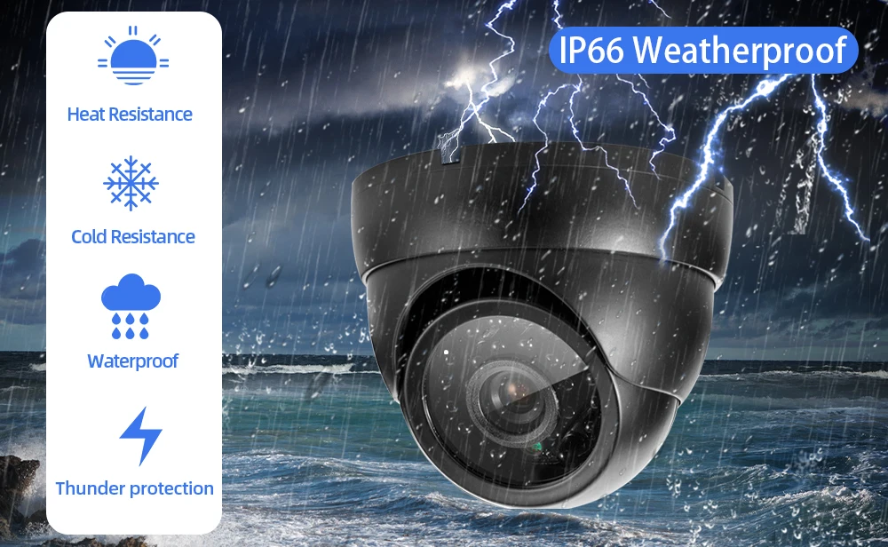 Используйте их в качестве наружных камер или внутренних камер, так как они построены жестко, чтобы выдерживать любую погоду: дождь, снег, пыль и жаркие дни. С защитой от атмосферных воздействий IP66 и кабелями, проходящими через подставку для дополнительной защиты, гарантируем, что вы сможете ответить на их производительность, день в день. Наша камера имеет сверхпрочный металлический корпус, профессиональный IP66, устойчивый к атмосферным воздействиям, обеспечивая стабильную производительность как внутри, так и снаружи.