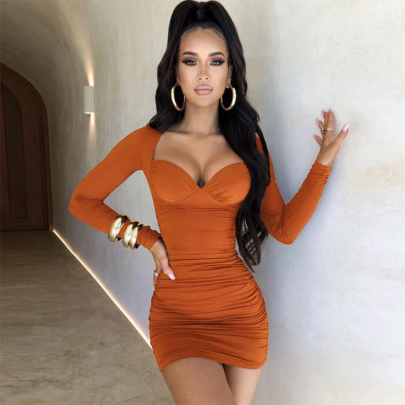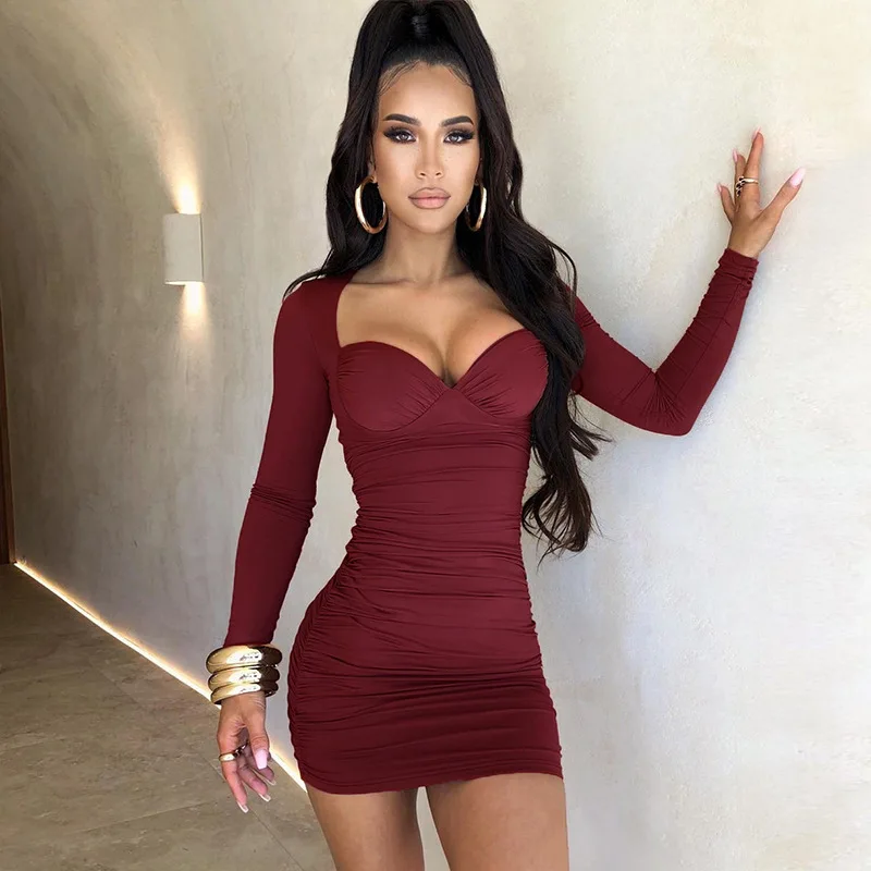 Платье-мини с длинным рукавом, глубоким V-образным вырезом, с высокой талией
