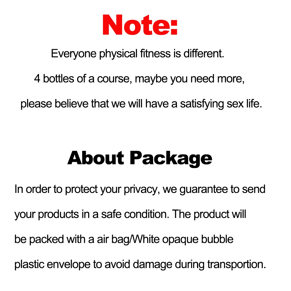 Недавно многие покупатели спросили, сколько бутылок нужно для роста 4 см, 3 см и 2 см? Тем не менее, в соответствии с отзывы от наших покупателей в том случае, если у вас нет 18 см, вы можете использовать четыре бутылки, который может легко увеличить 1,5 см. Если у вас уже есть 18 см, мы не рекомендуем Вам покупать наши продукты, которые могут не быть улучшены снова. Спасибо за понимание и желаем вам лучшей сексуальной жизни!